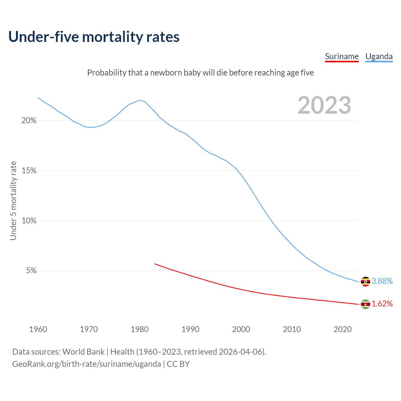 The chance that a newborn baby will die before reaching age five is 1.62% in Suriname and 3.88% in Uganda. Above is a chart with historical data on under-five mortality rates.