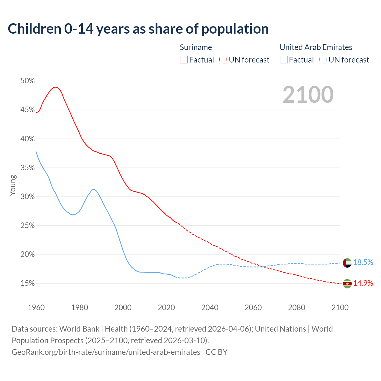 Suriname has an annual birth rate of 17.3 births per 1,000 people, compared to 9.77 for the United Arab Emirates. The average number of children a woman is expected to have during her lifetime — the fertility rate, is 2.25 in Suriname and 1.2 in the United Arab Emirates — 46.6% difference.