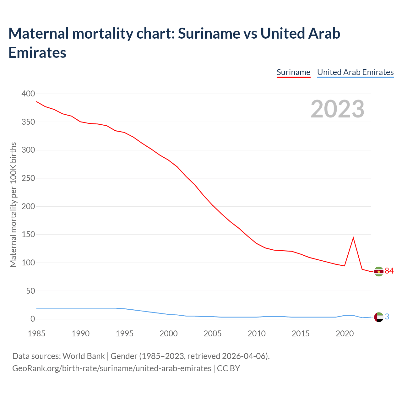 The maternal mortality rate, which is the probability of dying during childbirth or within 42 days of pregnancy termination, is 84 deaths per 100,000 live births in Suriname, compared to 3 deaths in the United Arab Emirates.