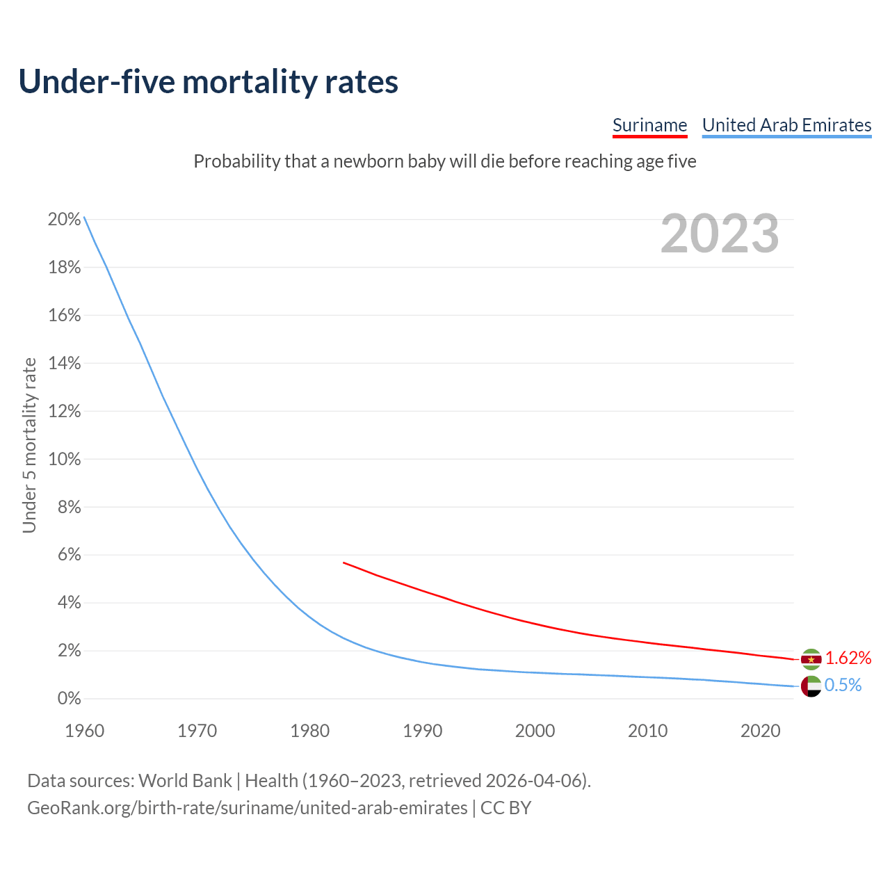 The chance that a newborn baby will die before reaching age five is 1.62% in Suriname and 0.5% in the United Arab Emirates. Above is a chart with historical data on under-five mortality rates.
