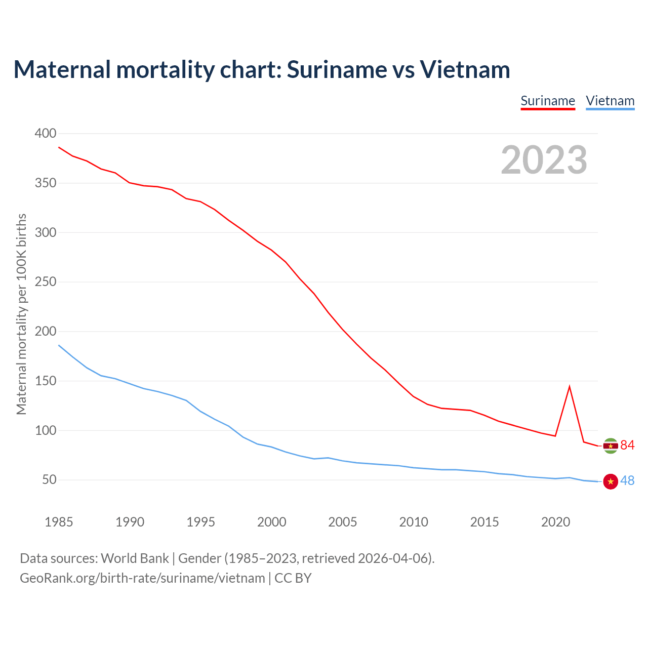 The maternal mortality rate, which is the probability of dying during childbirth or within 42 days of pregnancy termination, is 84 deaths per 100,000 live births in Suriname, compared to 48 deaths in Vietnam.