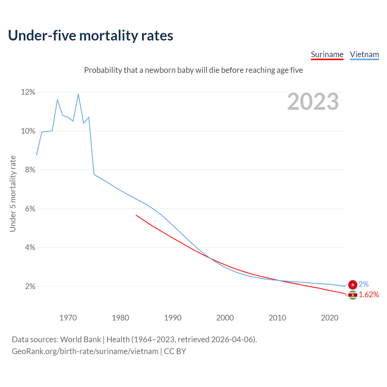The chance that a newborn baby will die before reaching age five is 1.62% in Suriname and 2% in Vietnam. Above is a chart with historical data on under-five mortality rates.