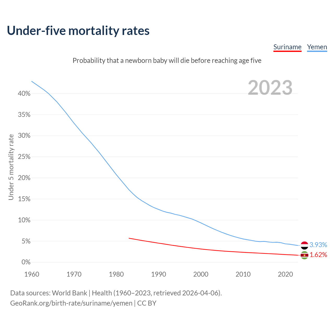 The chance that a newborn baby will die before reaching age five is 1.62% in Suriname and 3.93% in Yemen. Above is a chart with historical data on under-five mortality rates.