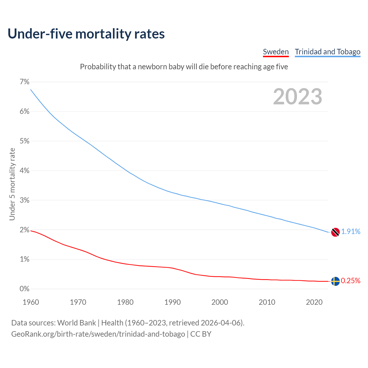 The chance that a newborn baby will die before reaching age five is 0.25% in Sweden and 1.91% in Trinidad and Tobago. Above is a chart with historical data on under-five mortality rates.