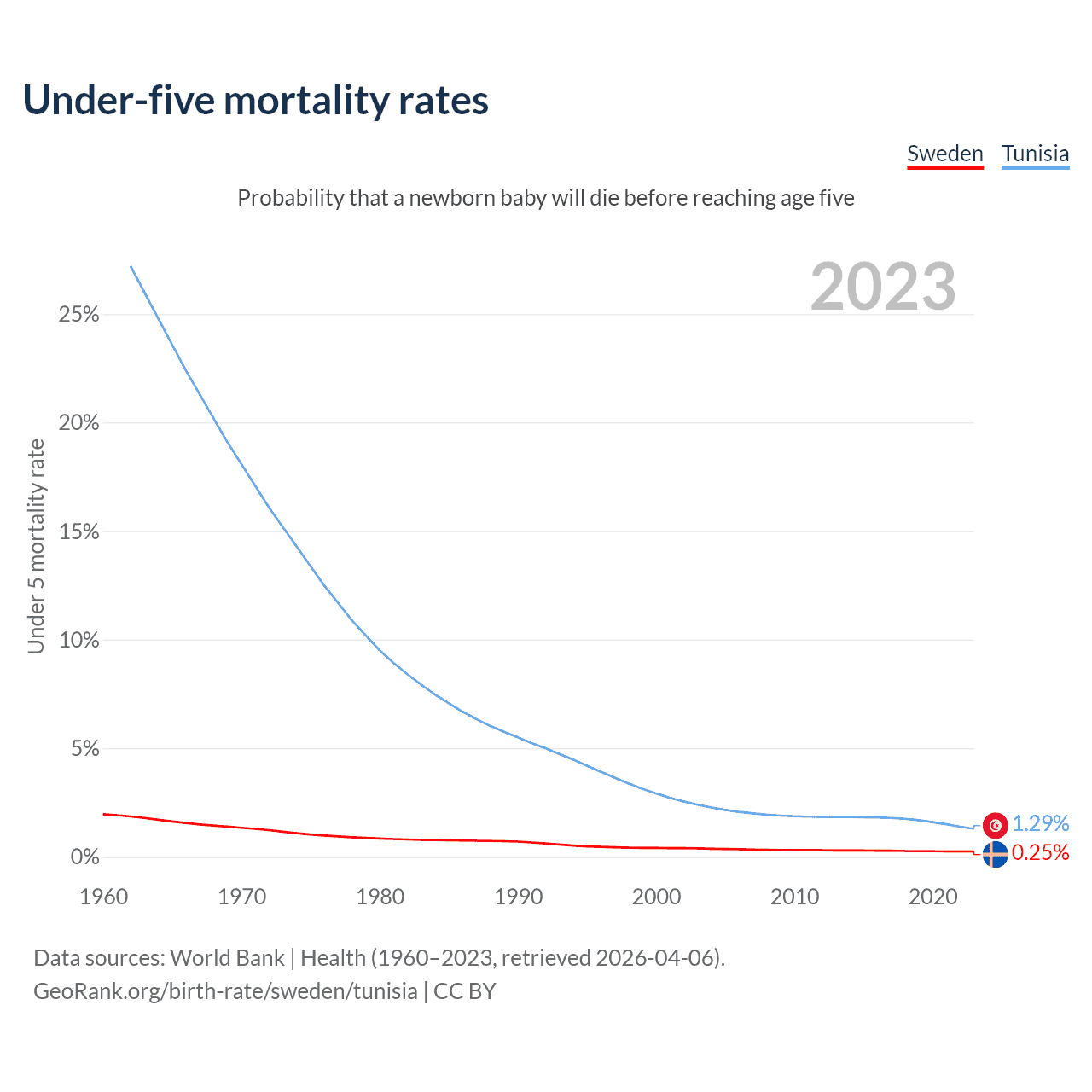 The chance that a newborn baby will die before reaching age five is 0.25% in Sweden and 1.29% in Tunisia. Above is a chart with historical data on under-five mortality rates.