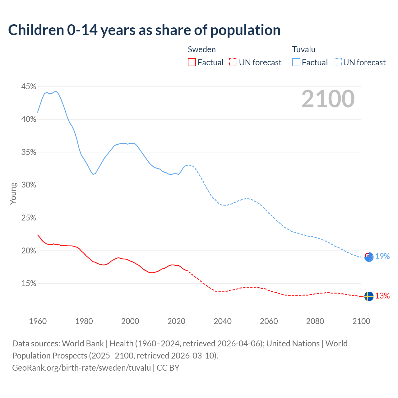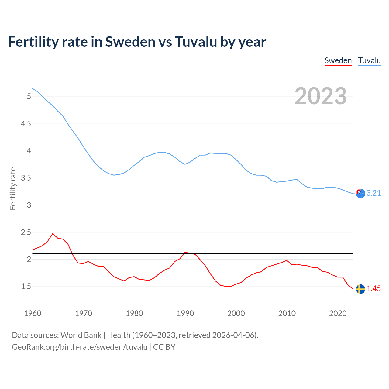 According to the latest available data on birth rates, the fertility rate in Sweden was 1.45 children per woman in 2023, compared to 3.21 in Tuvalu in 2023. The replacement level is considered to be 2.1 children per woman.