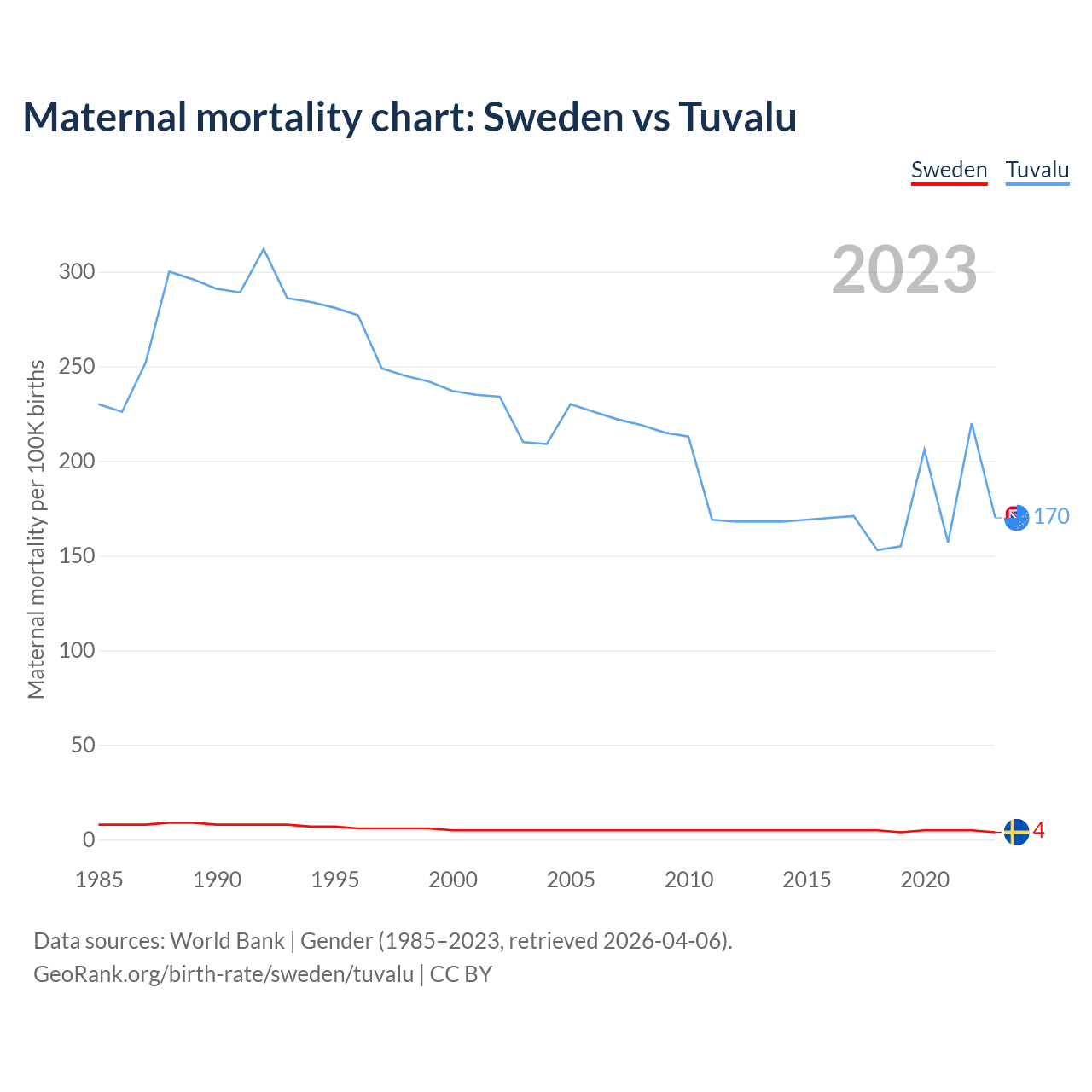 The maternal mortality rate, which is the probability of dying during childbirth or within 42 days of pregnancy termination, is 4 deaths per 100,000 live births in Sweden, compared to 170 deaths in Tuvalu.