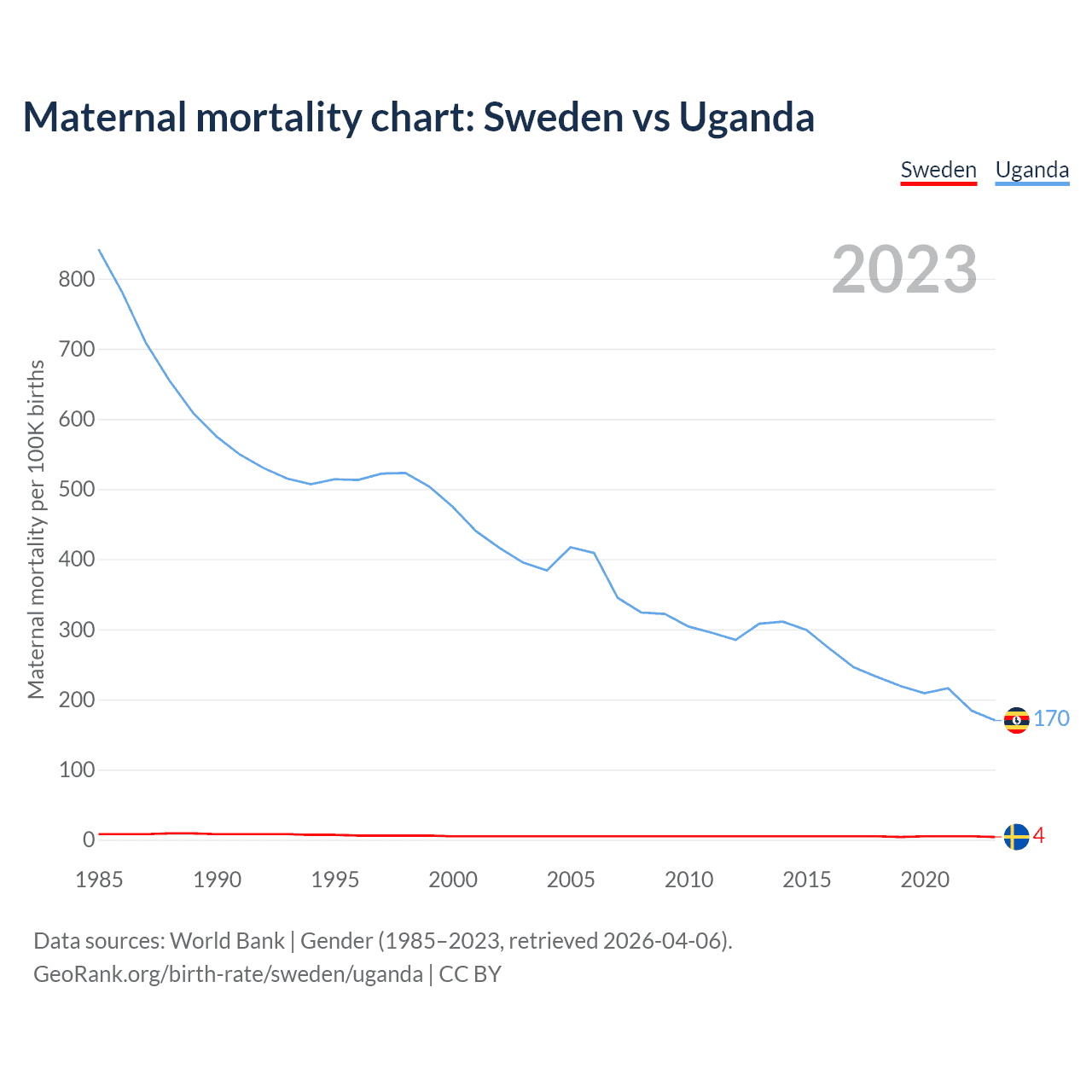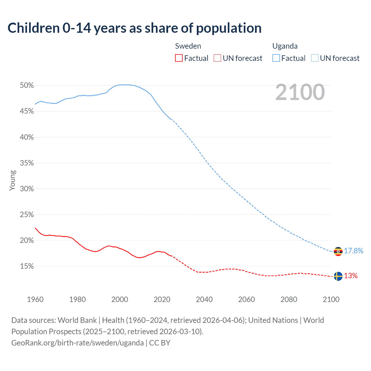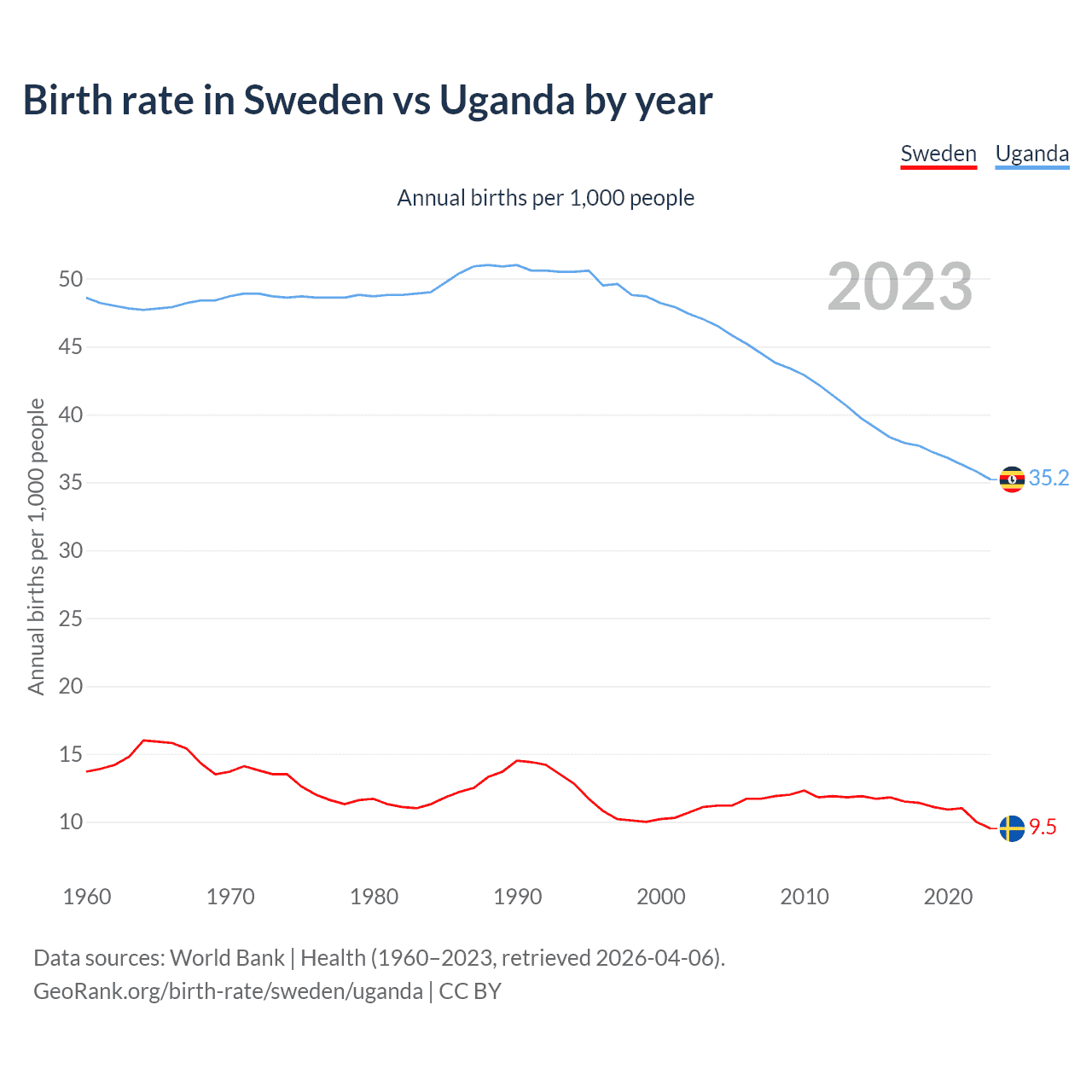 According to the latest available data on birth rates, the fertility rate in Sweden was 1.45 children per woman in 2023, compared to 4.28 in Uganda in 2023. The replacement level is considered to be 2.1 children per woman.
