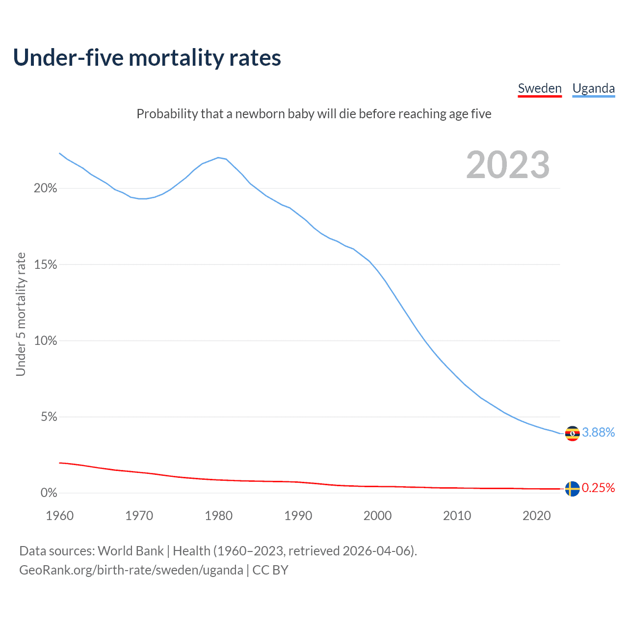 The chance that a newborn baby will die before reaching age five is 0.25% in Sweden and 3.88% in Uganda. Above is a chart with historical data on under-five mortality rates.