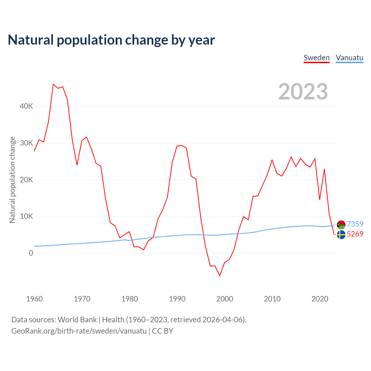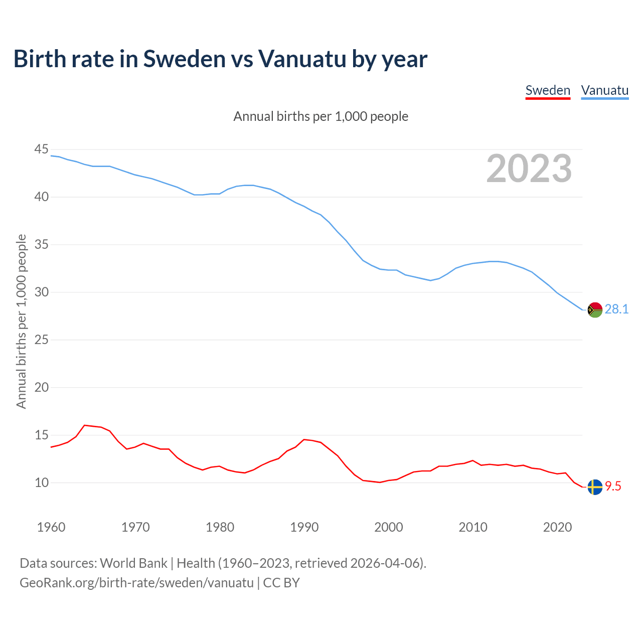 Sweden has an annual birth rate of 9.5 births per 1,000 people, compared to 28.1 for Vanuatu. The average number of children a woman is expected to have during her lifetime — the fertility rate, is 1.45 in Sweden and 3.6 in Vanuatu — 148% difference.