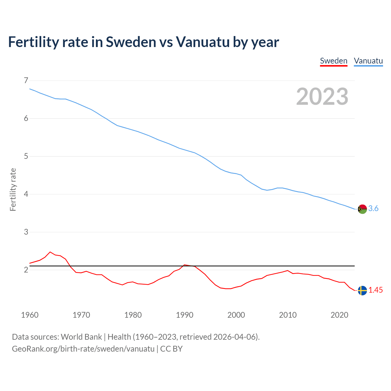 According to the latest available data on birth rates, the fertility rate in Sweden was 1.45 children per woman in 2023, compared to 3.6 in Vanuatu in 2023. The replacement level is considered to be 2.1 children per woman.