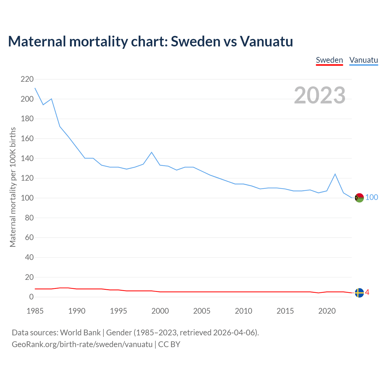 The maternal mortality rate, which is the probability of dying during childbirth or within 42 days of pregnancy termination, is 4 deaths per 100,000 live births in Sweden, compared to 100 deaths in Vanuatu.