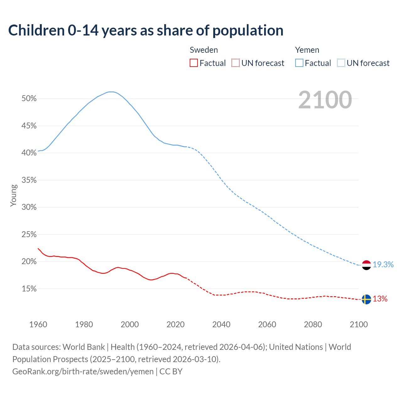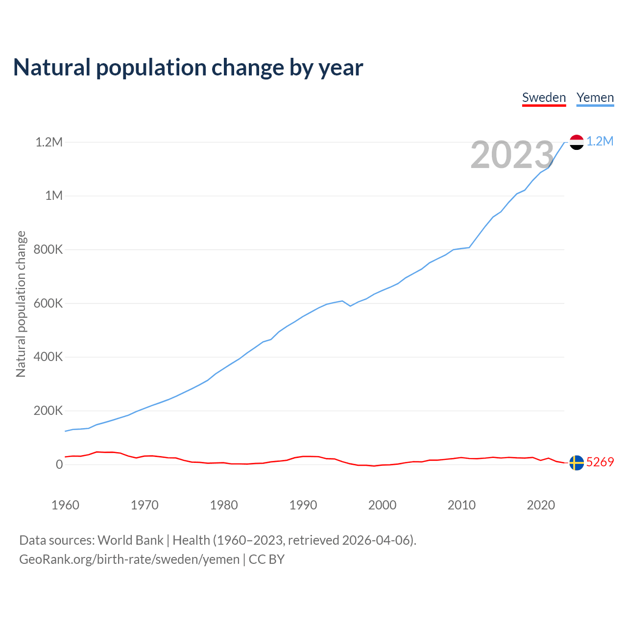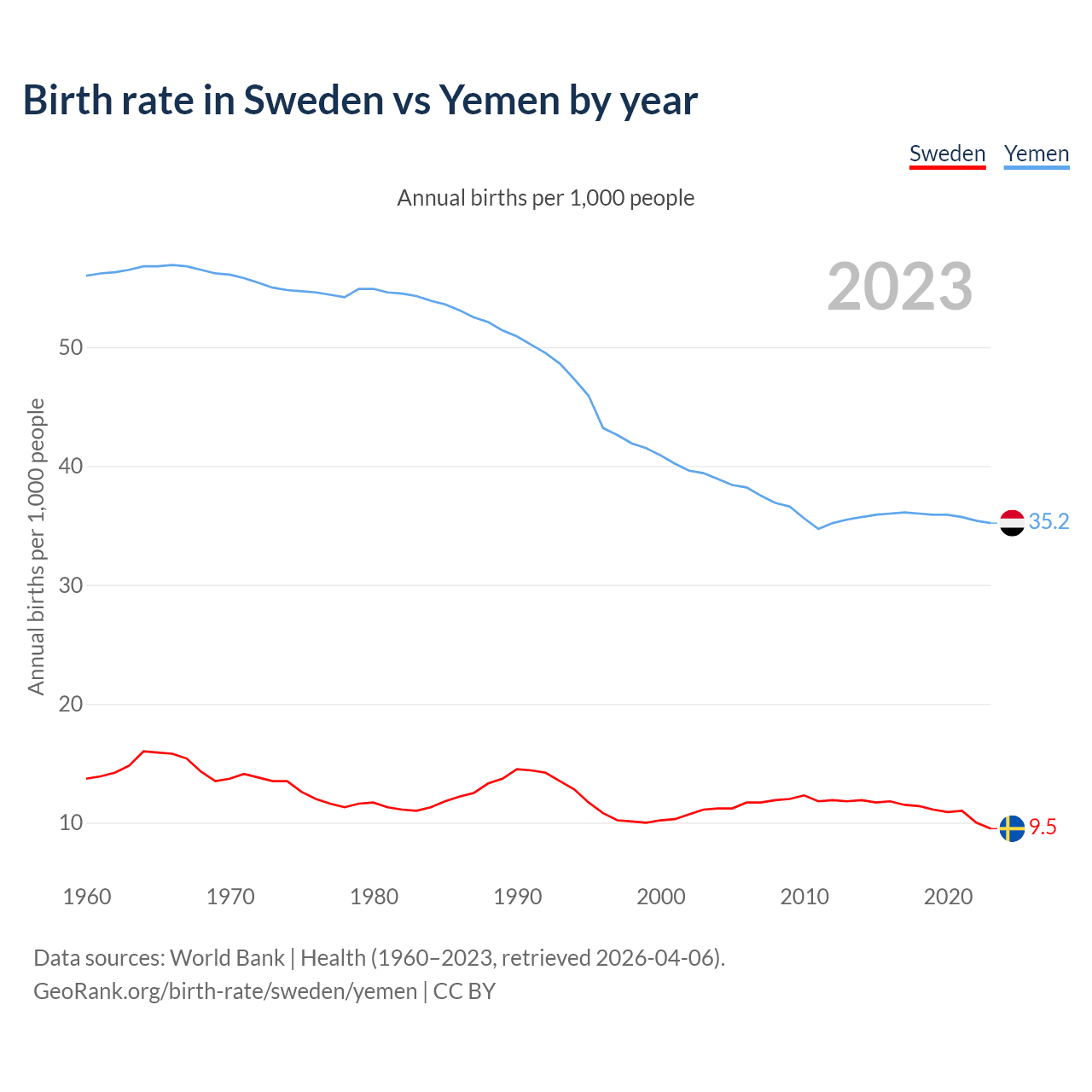 Sweden has an annual birth rate of 9.5 births per 1,000 people, compared to 35.2 for Yemen. The average number of children a woman is expected to have during her lifetime — the fertility rate, is 1.45 in Sweden and 4.59 in Yemen — 216.6% difference.
