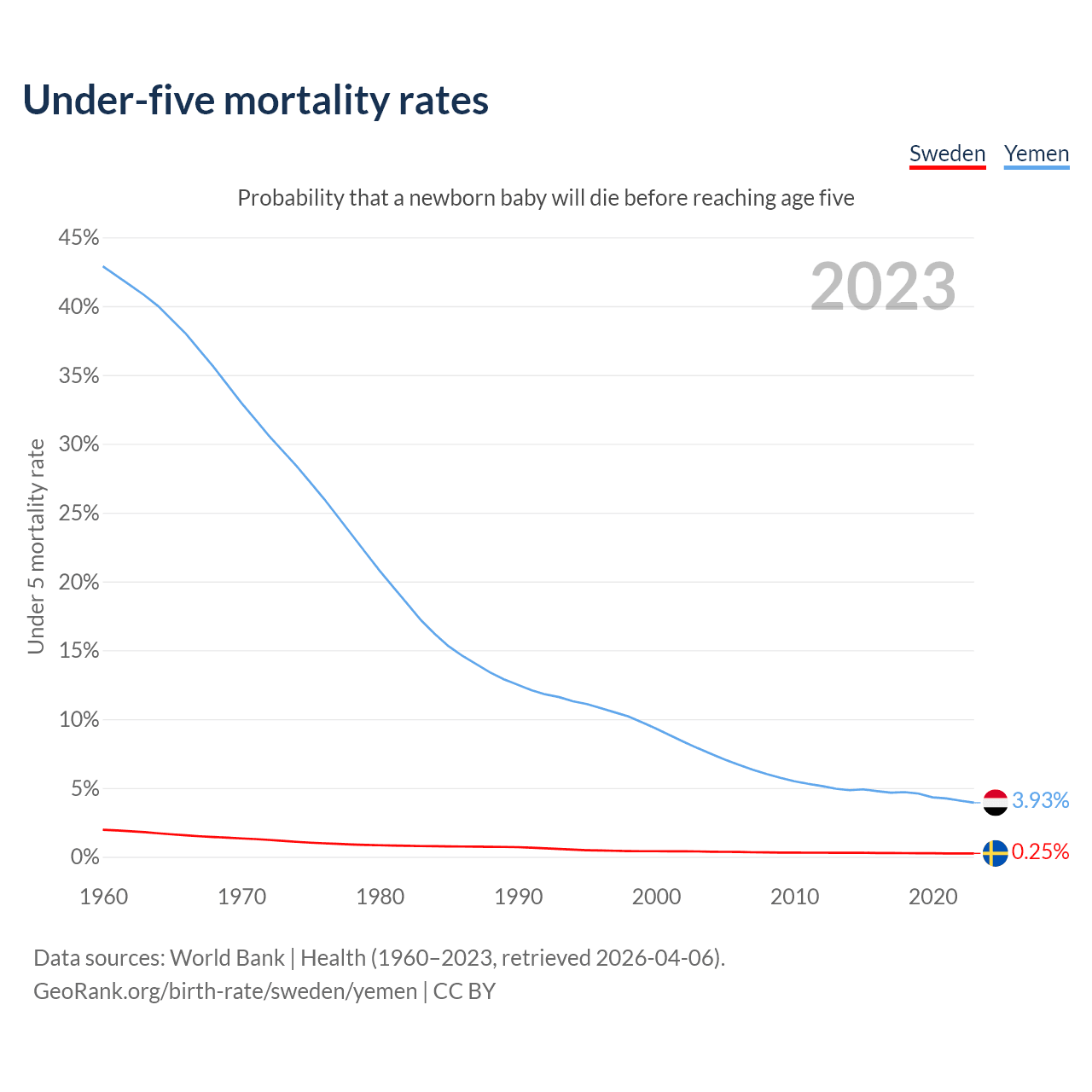 The chance that a newborn baby will die before reaching age five is 0.25% in Sweden and 3.93% in Yemen. Above is a chart with historical data on under-five mortality rates.