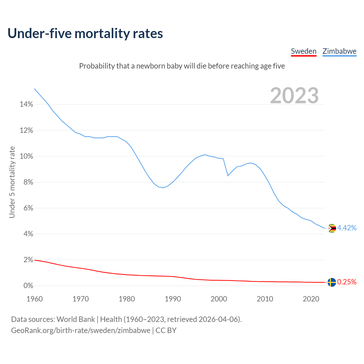 The chance that a newborn baby will die before reaching age five is 0.25% in Sweden and 4.42% in Zimbabwe. Above is a chart with historical data on under-five mortality rates.