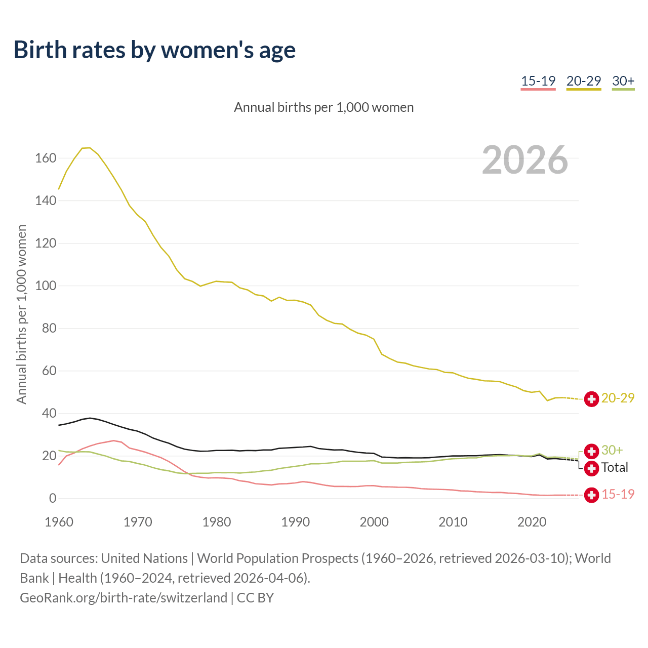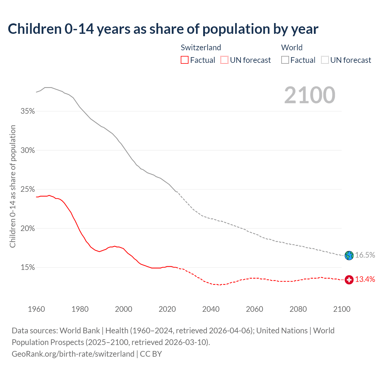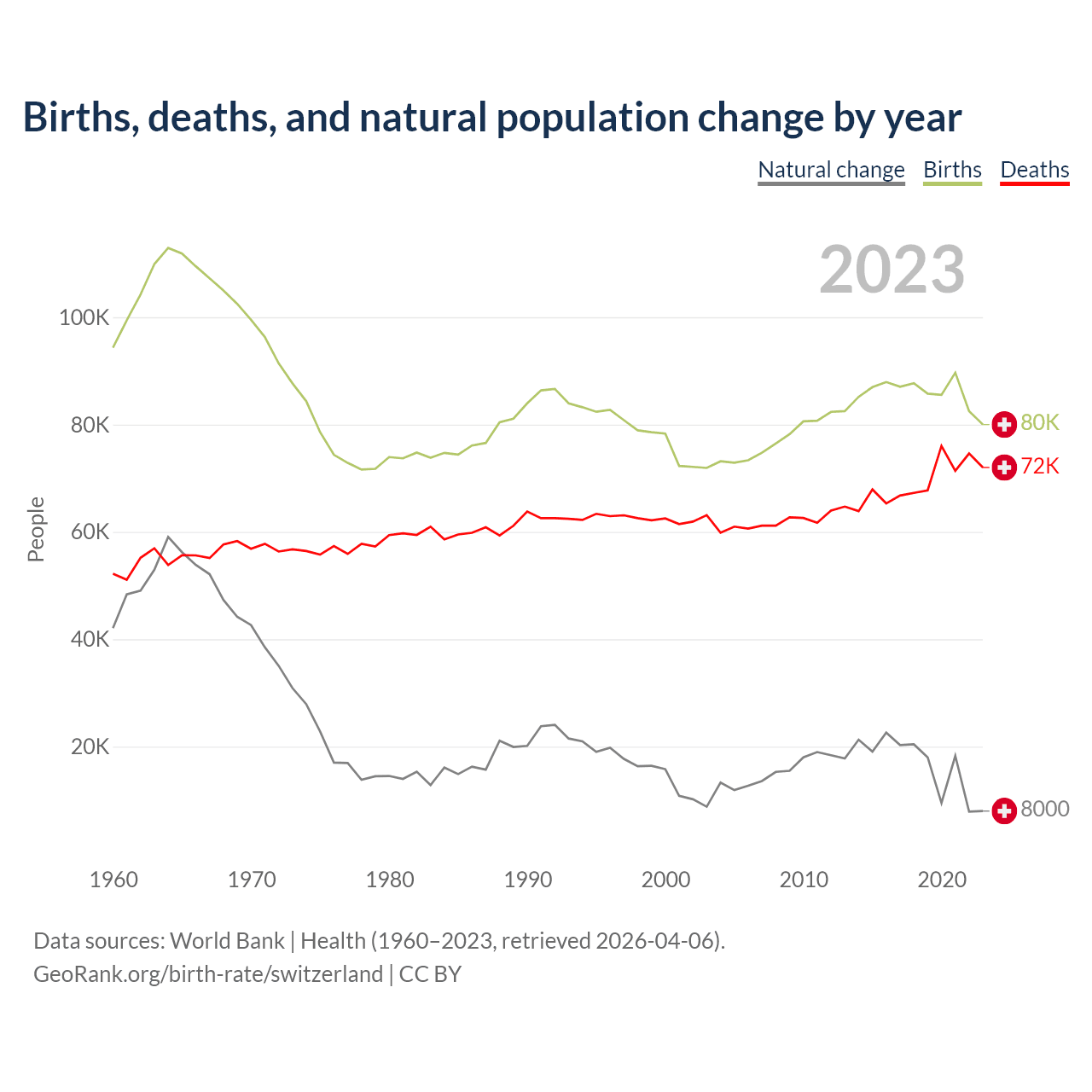 According to the latest birth rate data available, the fertility rate in Switzerland was 1.33 in 2023 and has been below the replacement level of 2.1 children per woman since 1971. In 1993, the fertility rate was 1.51 — a 11.9% decline in 30 years.