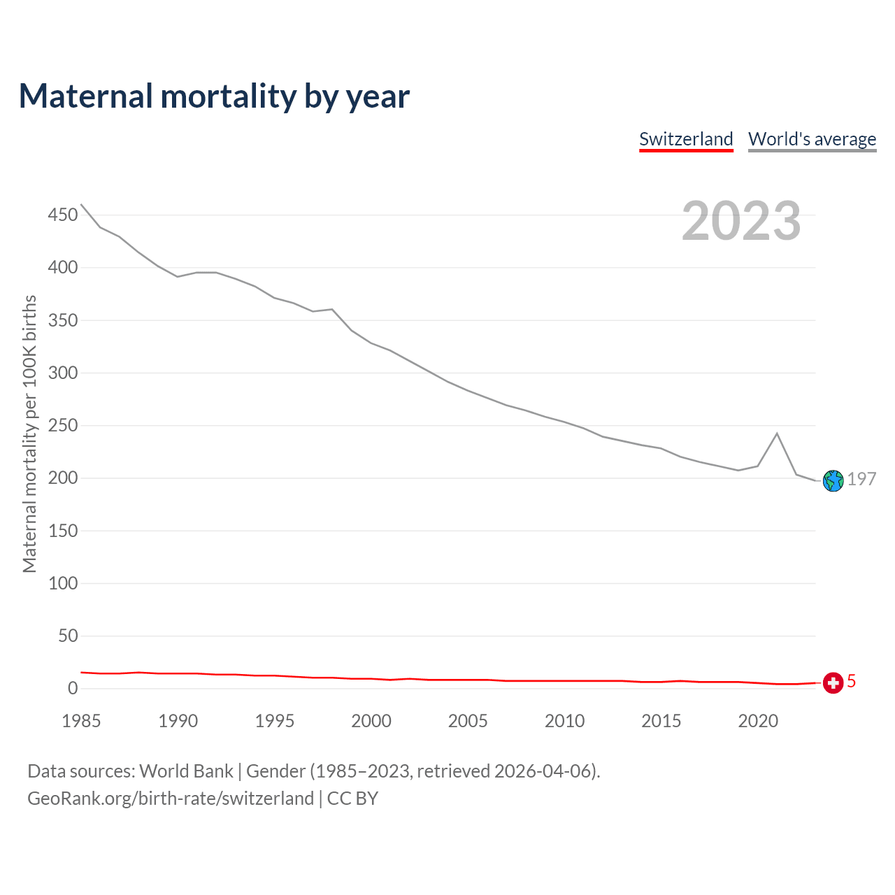 The maternal mortality rate in Switzerland was 5 deaths per 100,000 live births in 2023 — a 0.005% chance of dying during childbirth or within 42 days of pregnancy termination. This is a 44.4% decrease compared to the year 2000.