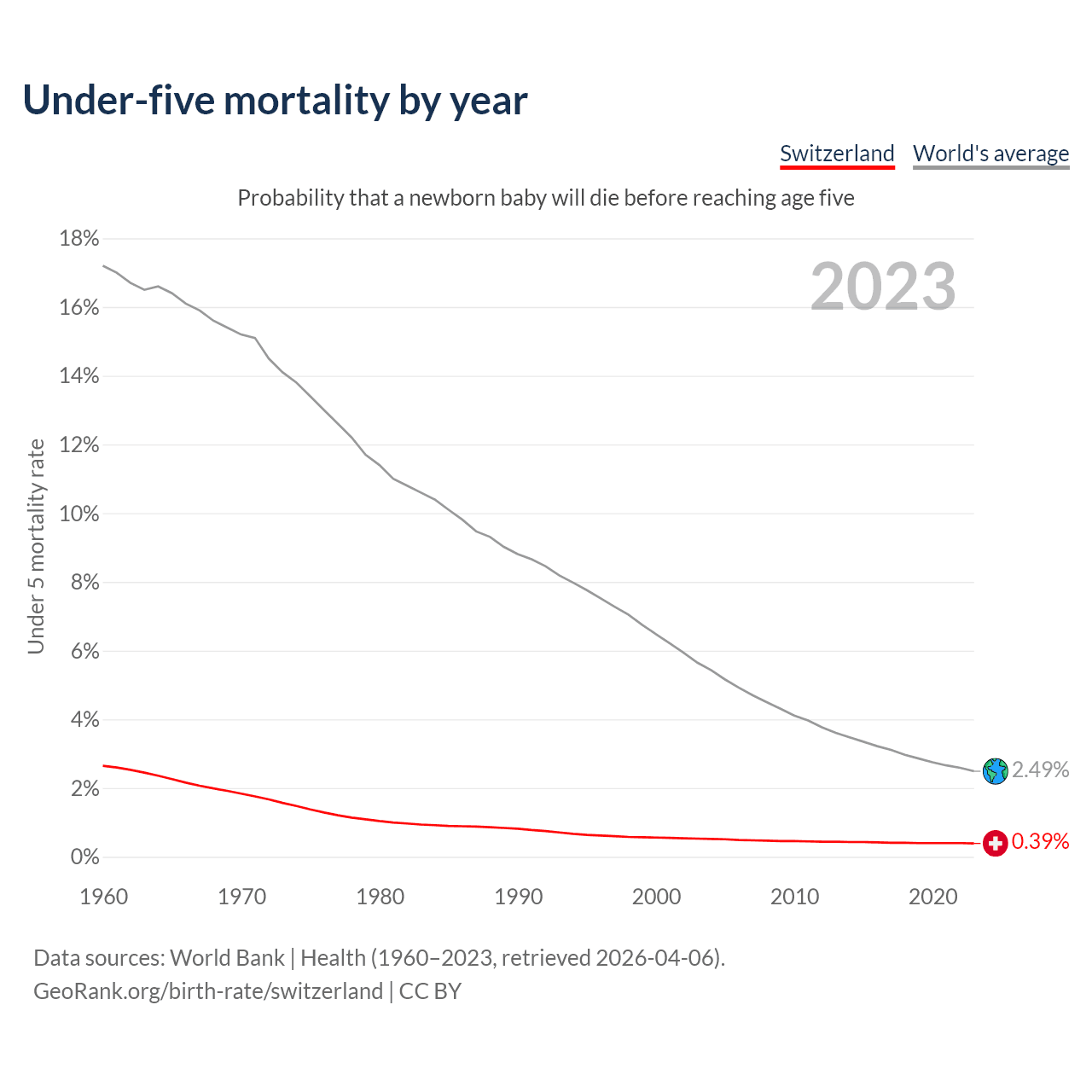 The under-5 mortality rate in Switzerland was 3.9 deaths per 1,000 live births in 2023 — a 0.39% chance that a newborn baby will die before reaching age five. This is down from 5.6 deaths per 1,000 live births in 2000.