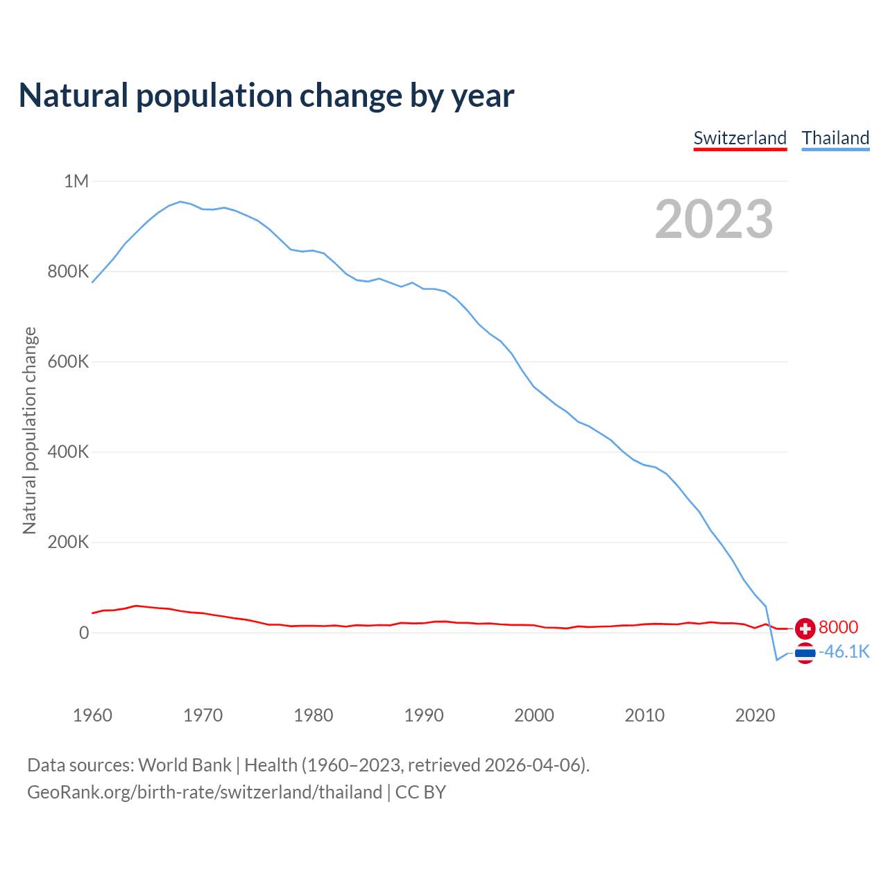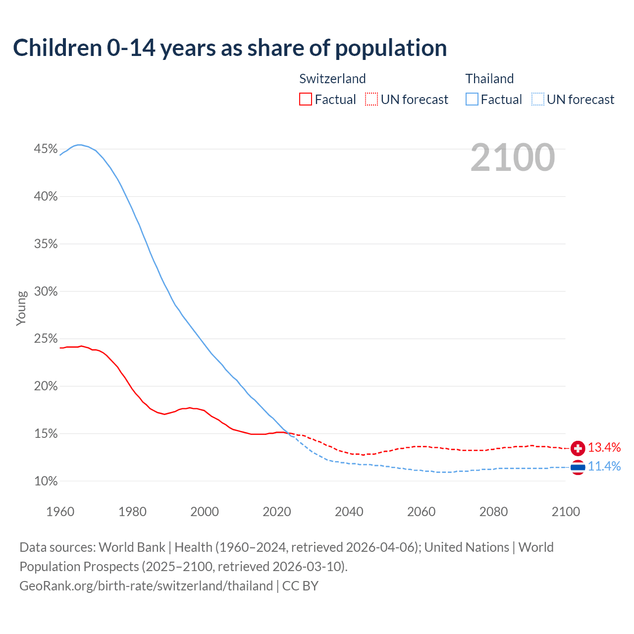 According to the latest available data on birth rates, the fertility rate in Switzerland was 1.33 children per woman in 2023, compared to 1.21 in Thailand in 2023. The replacement level is considered to be 2.1 children per woman.