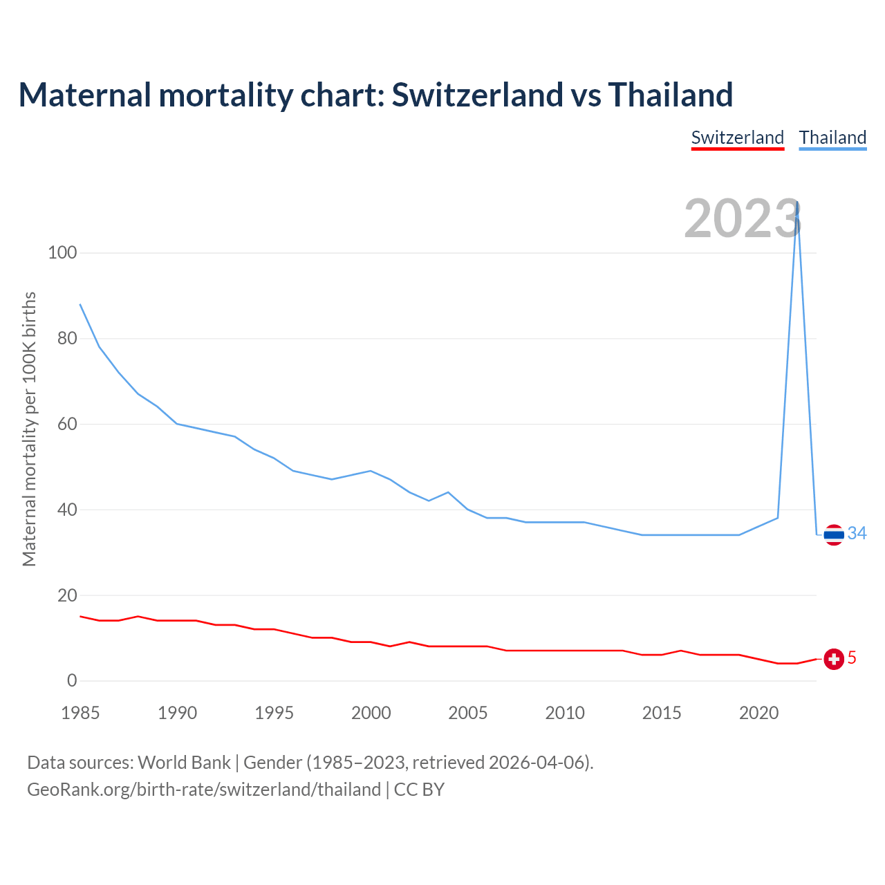 The maternal mortality rate, which is the probability of dying during childbirth or within 42 days of pregnancy termination, is 5 deaths per 100,000 live births in Switzerland, compared to 34 deaths in Thailand.