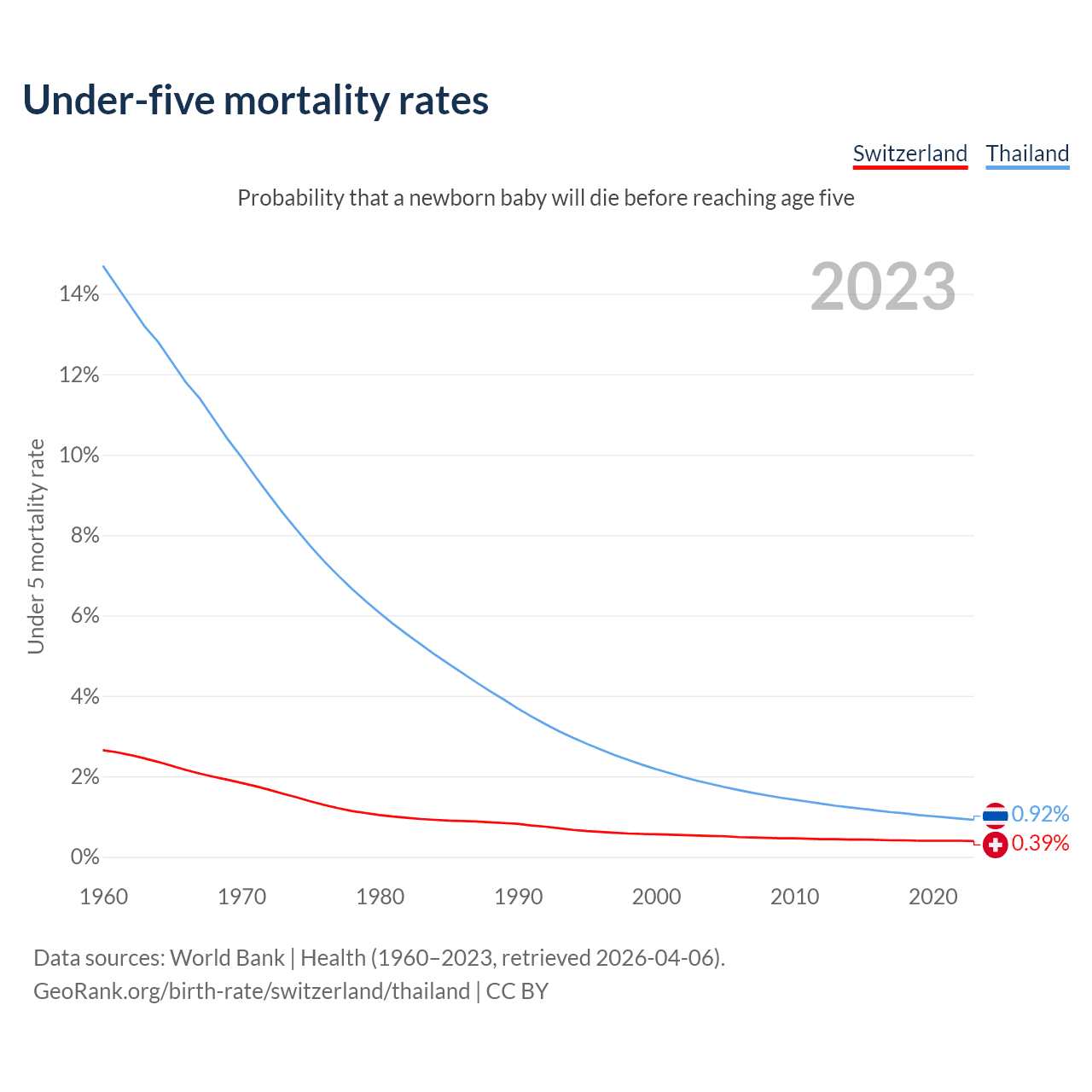 The chance that a newborn baby will die before reaching age five is 0.39% in Switzerland and 0.92% in Thailand. Above is a chart with historical data on under-five mortality rates.