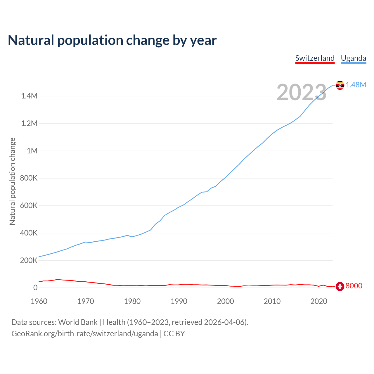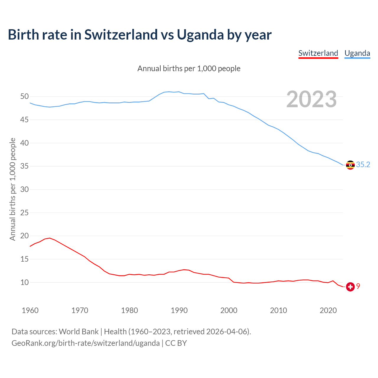 Switzerland has an annual birth rate of 9 births per 1,000 people, compared to 35.2 for Uganda. The average number of children a woman is expected to have during her lifetime — the fertility rate, is 1.33 in Switzerland and 4.28 in Uganda — 222% difference.