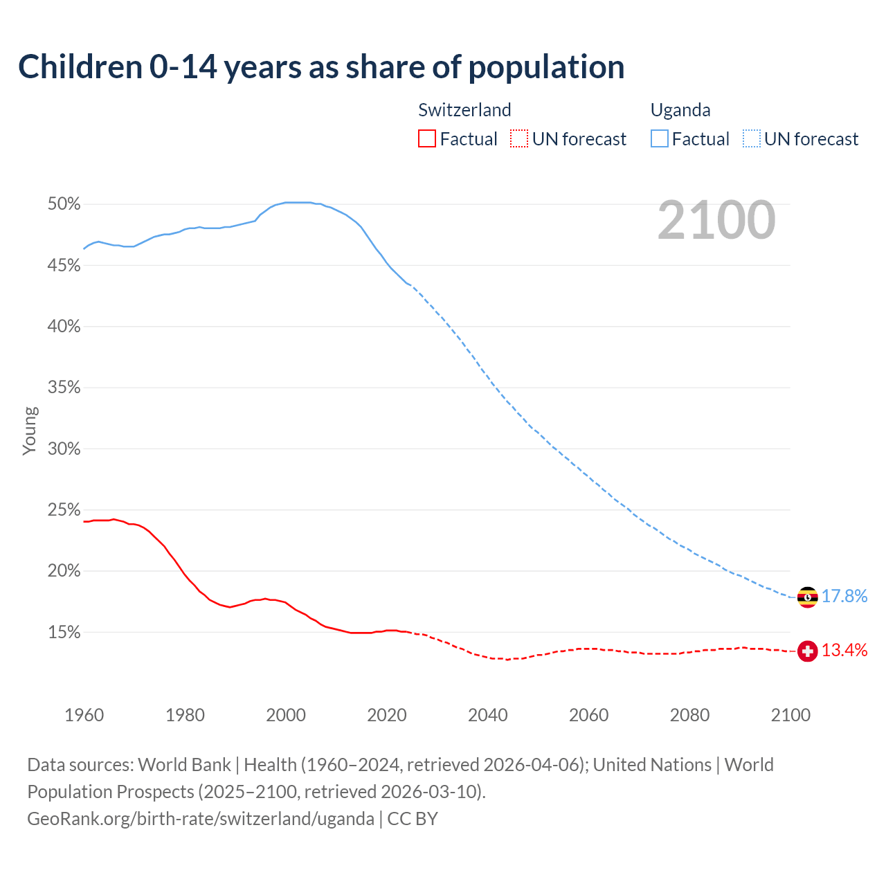 According to the latest available data on birth rates, the fertility rate in Switzerland was 1.33 children per woman in 2023, compared to 4.28 in Uganda in 2023. The replacement level is considered to be 2.1 children per woman.