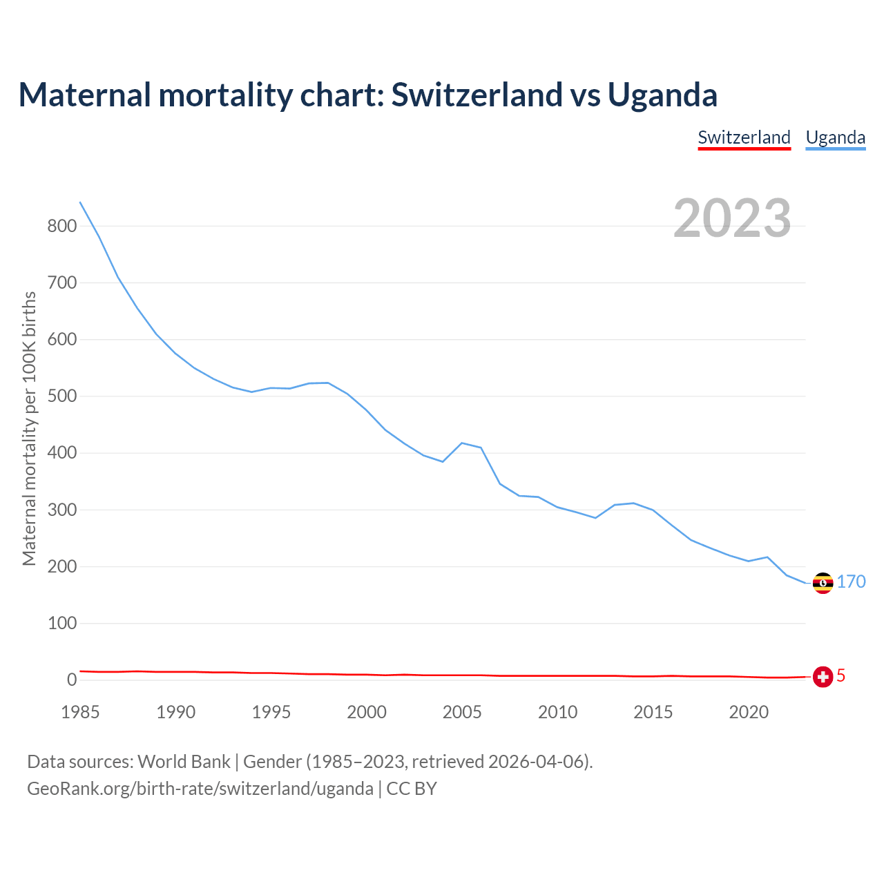 The maternal mortality rate, which is the probability of dying during childbirth or within 42 days of pregnancy termination, is 5 deaths per 100,000 live births in Switzerland, compared to 170 deaths in Uganda.