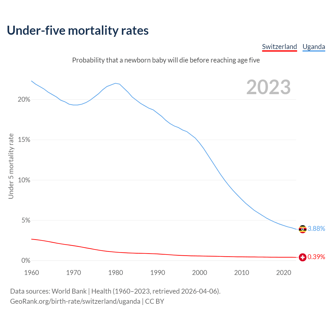 The chance that a newborn baby will die before reaching age five is 0.39% in Switzerland and 3.88% in Uganda. Above is a chart with historical data on under-five mortality rates.