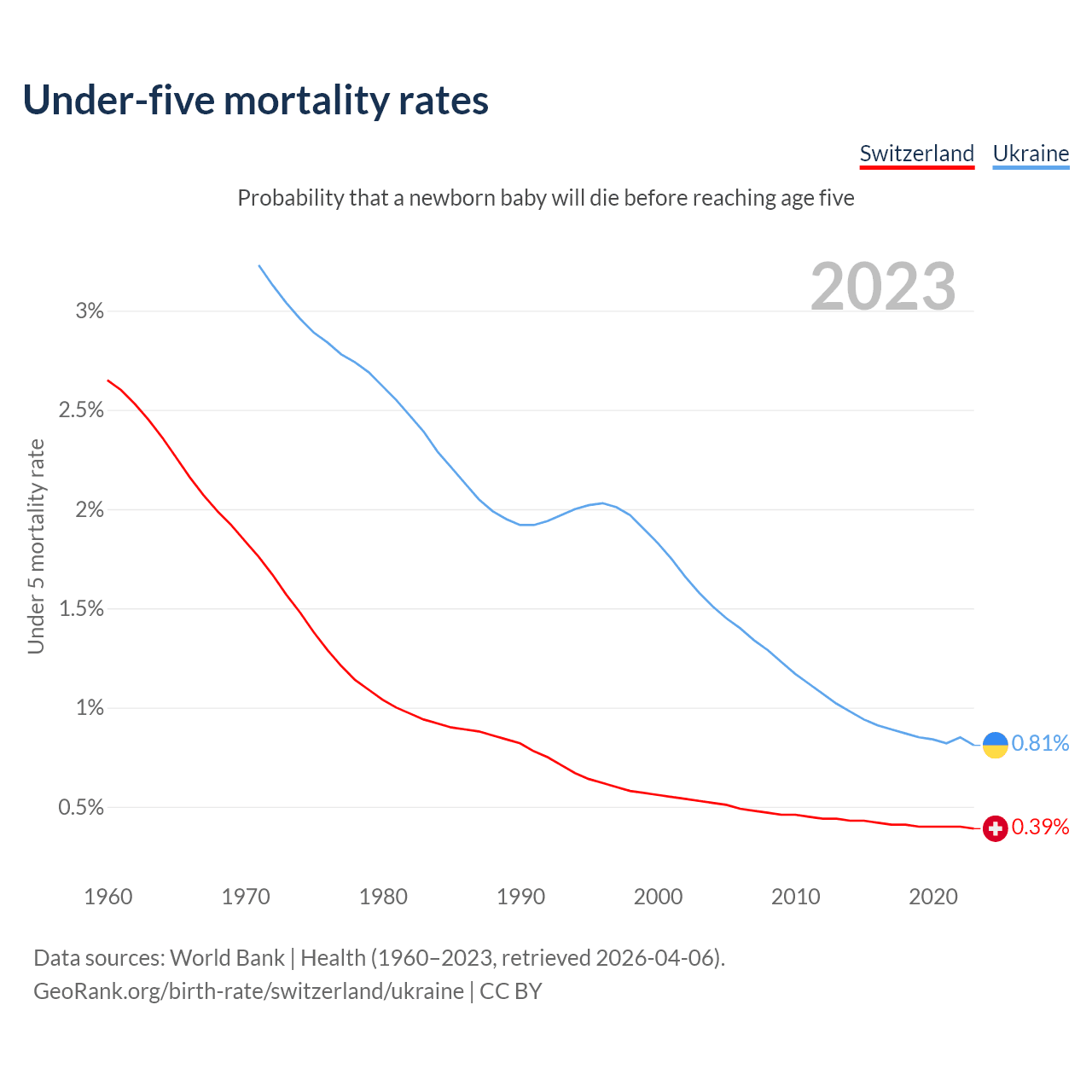 The chance that a newborn baby will die before reaching age five is 0.39% in Switzerland and 0.81% in Ukraine. Above is a chart with historical data on under-five mortality rates.