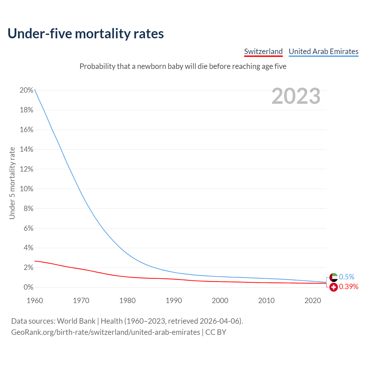 The chance that a newborn baby will die before reaching age five is 0.39% in Switzerland and 0.5% in the United Arab Emirates. Above is a chart with historical data on under-five mortality rates.