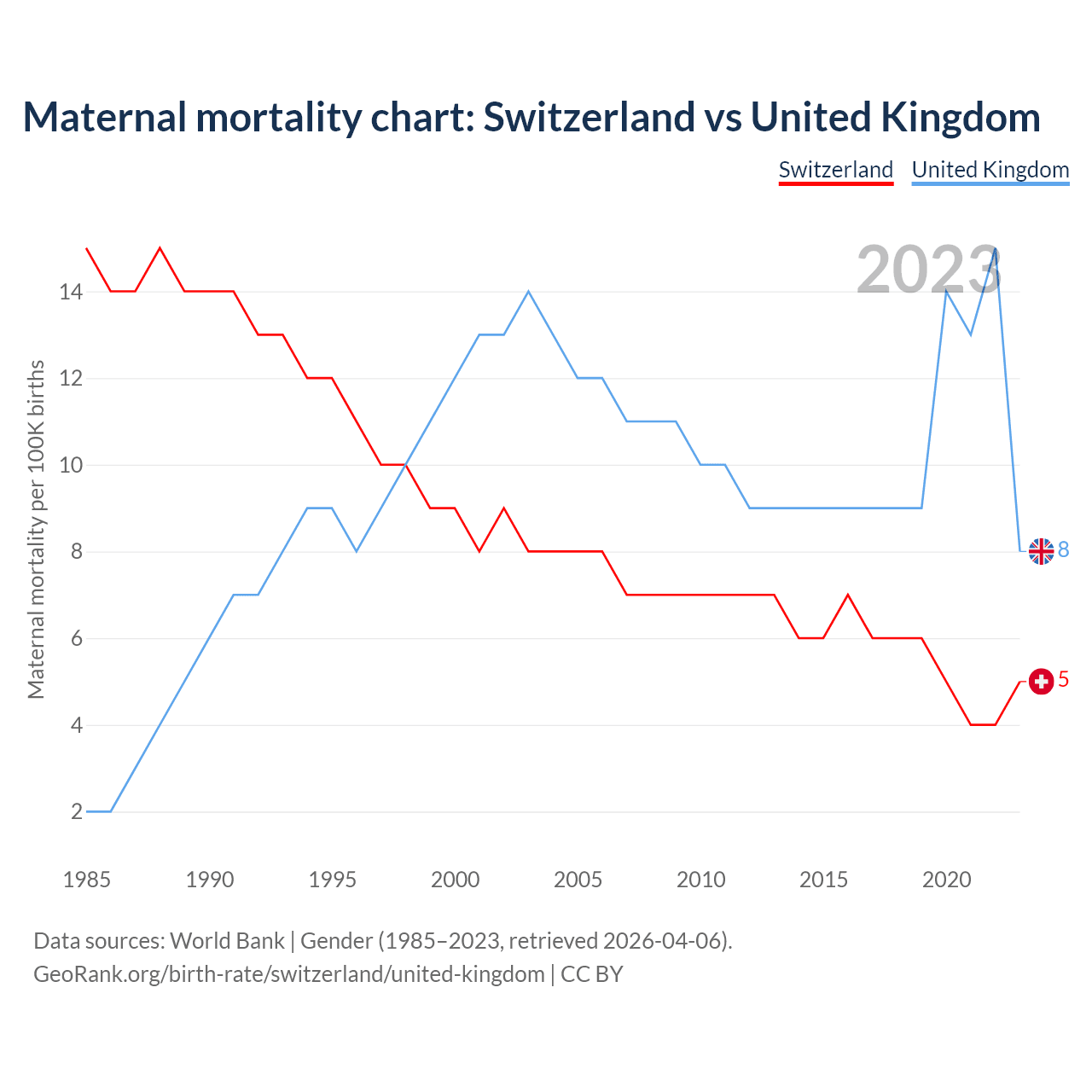 The maternal mortality rate, which is the probability of dying during childbirth or within 42 days of pregnancy termination, is 5 deaths per 100,000 live births in Switzerland, compared to 8 deaths in the United Kingdom.