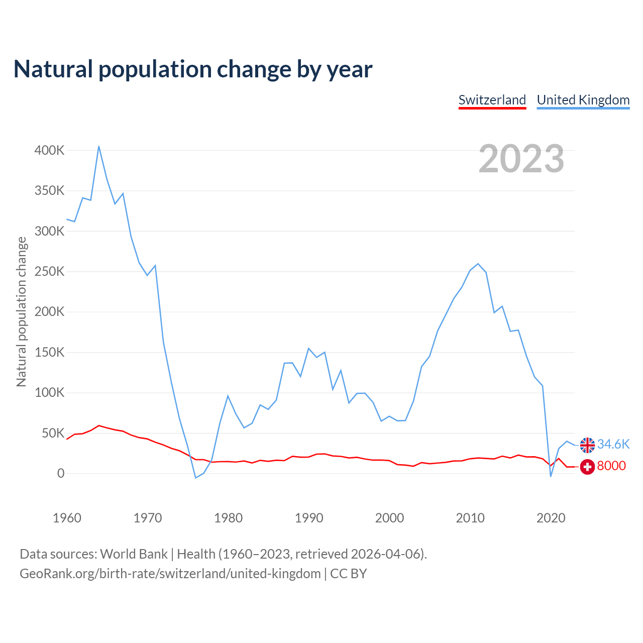 Switzerland has an annual birth rate of 9 births per 1,000 people, compared to 10 for the United Kingdom. The average number of children a woman is expected to have during her lifetime — the fertility rate, is 1.33 in Switzerland and 1.56 in the United Kingdom — 17.3% difference.