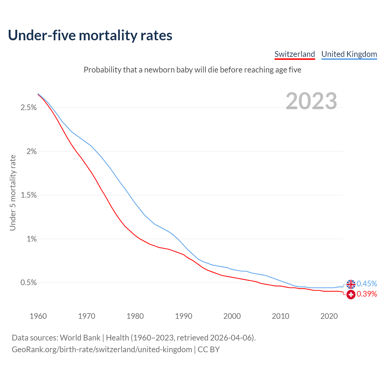 The chance that a newborn baby will die before reaching age five is 0.39% in Switzerland and 0.45% in the United Kingdom. Above is a chart with historical data on under-five mortality rates.
