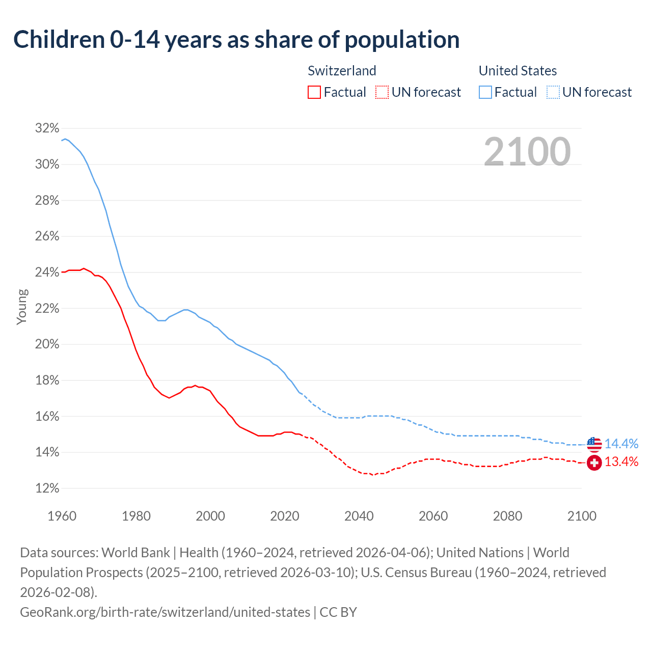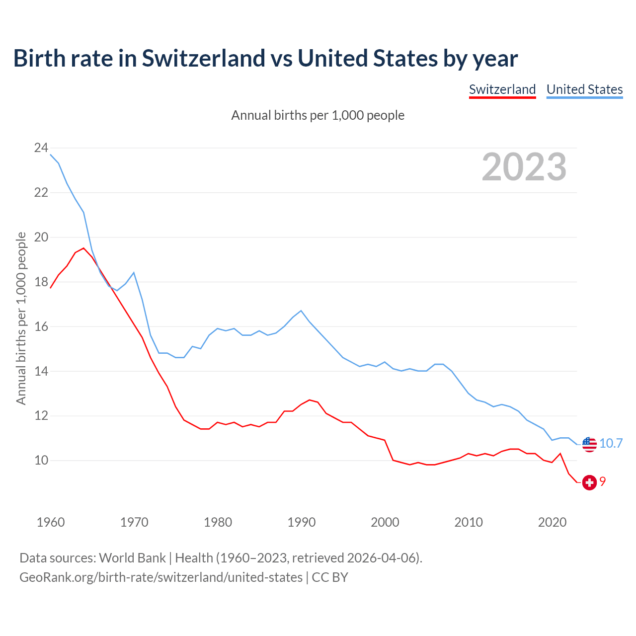 According to the latest available data on birth rates, the fertility rate in Switzerland was 1.33 children per woman in 2023, compared to 1.62 in the United States in 2023. The replacement level is considered to be 2.1 children per woman.
