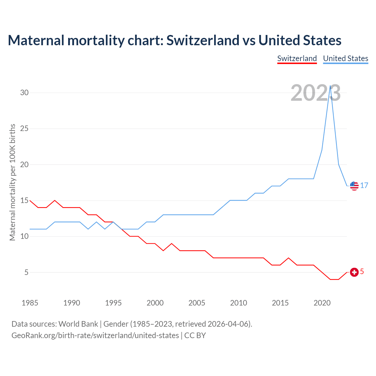 The maternal mortality rate, which is the probability of dying during childbirth or within 42 days of pregnancy termination, is 5 deaths per 100,000 live births in Switzerland, compared to 17 deaths in the United States.