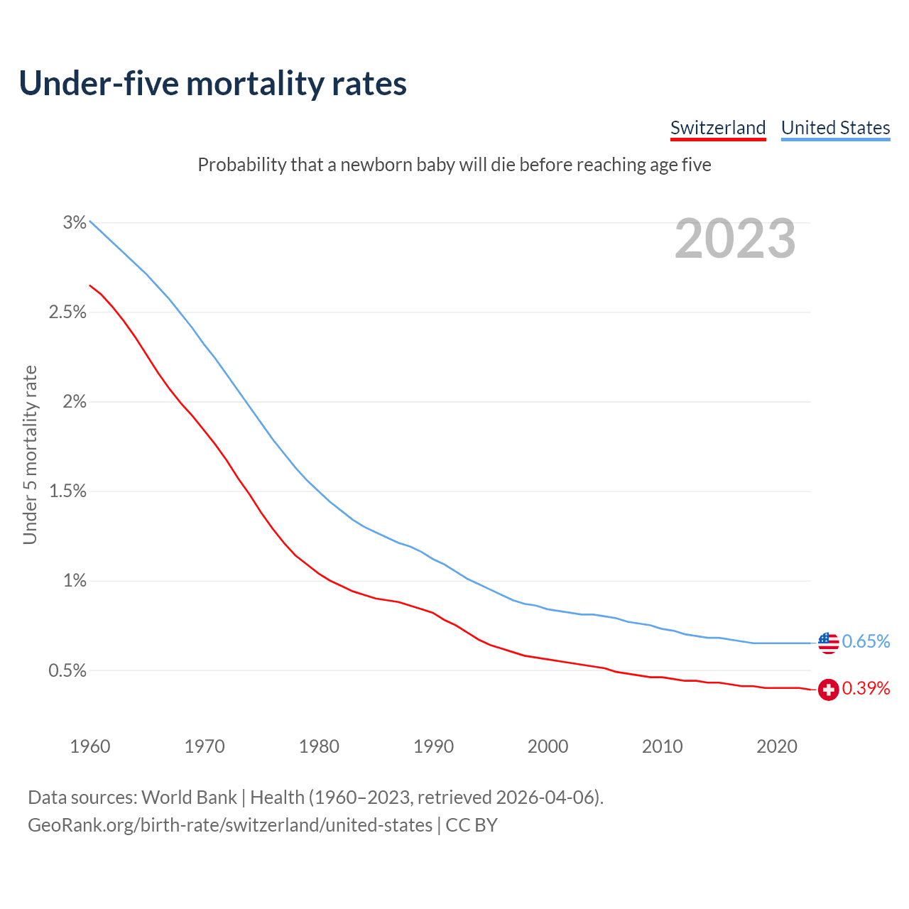 The chance that a newborn baby will die before reaching age five is 0.39% in Switzerland and 0.65% in the United States. Above is a chart with historical data on under-five mortality rates.