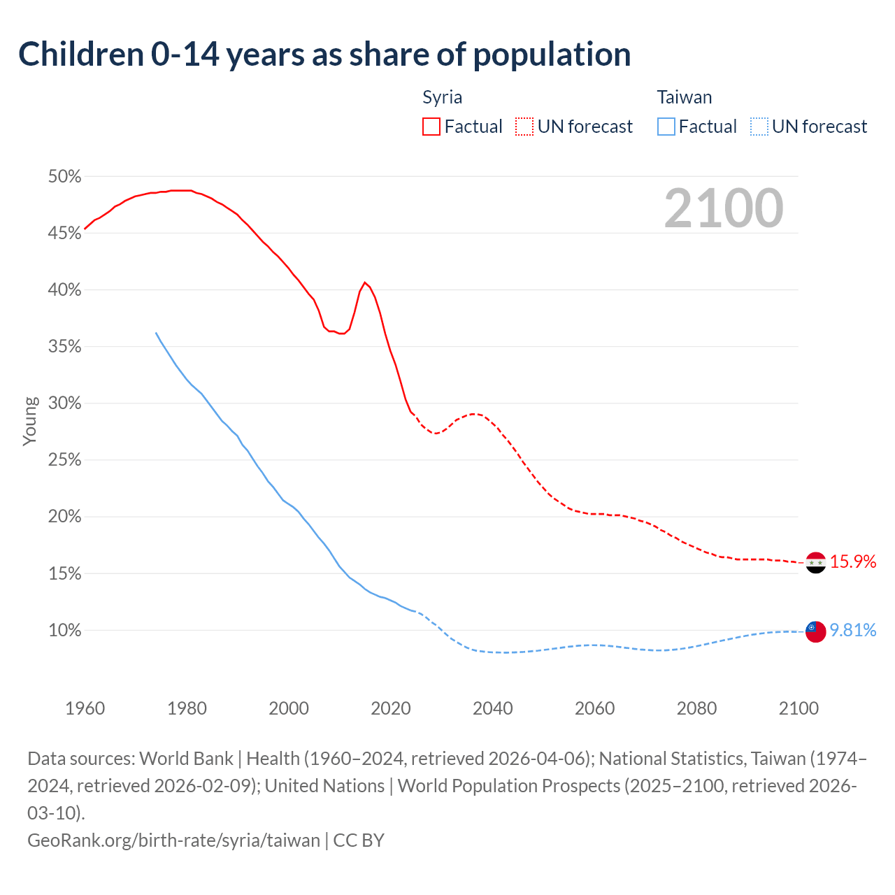 Data sources: World Bank | Health (1960–2024, retrieved 2026-04-06); National Statistics, Taiwan (1974–2024, retrieved 2026-02-09); United Nations | World Population Prospects (2025–2100, retrieved 2026-03-10).