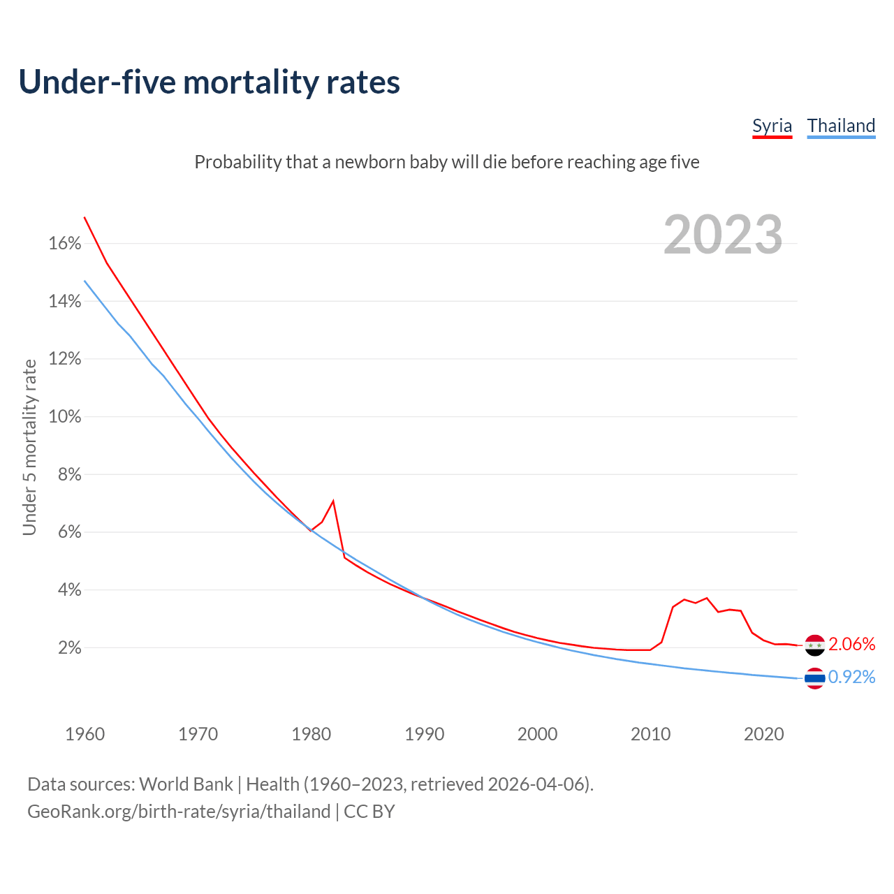 The chance that a newborn baby will die before reaching age five is 2.06% in Syria and 0.92% in Thailand. Above is a chart with historical data on under-five mortality rates.
