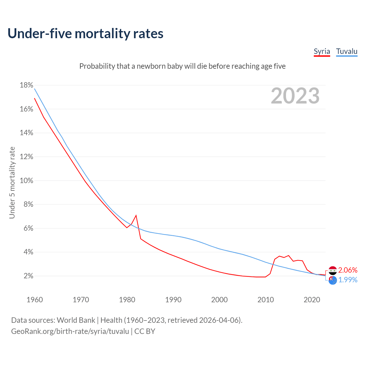 The chance that a newborn baby will die before reaching age five is 2.06% in Syria and 1.99% in Tuvalu. Above is a chart with historical data on under-five mortality rates.