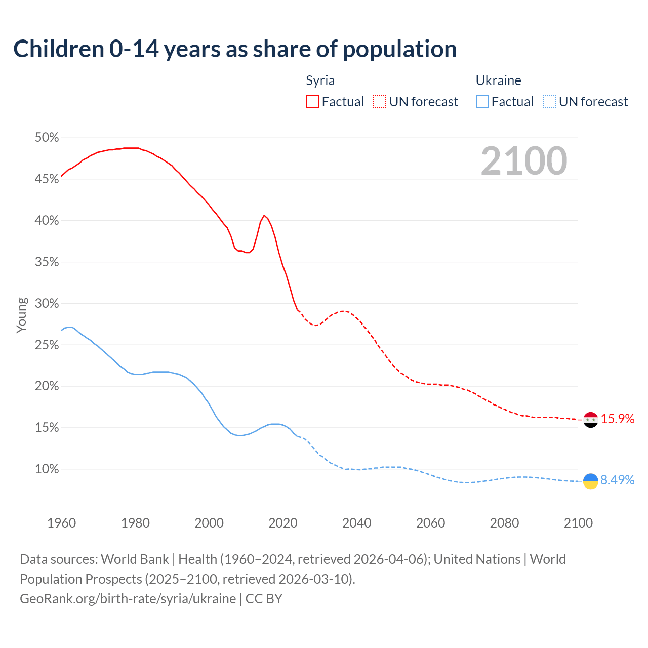 Syria has an annual birth rate of 22.1 births per 1,000 people, compared to 5.63 for Ukraine. The average number of children a woman is expected to have during her lifetime — the fertility rate, is 2.71 in Syria and 0.98 in Ukraine — 64% difference.