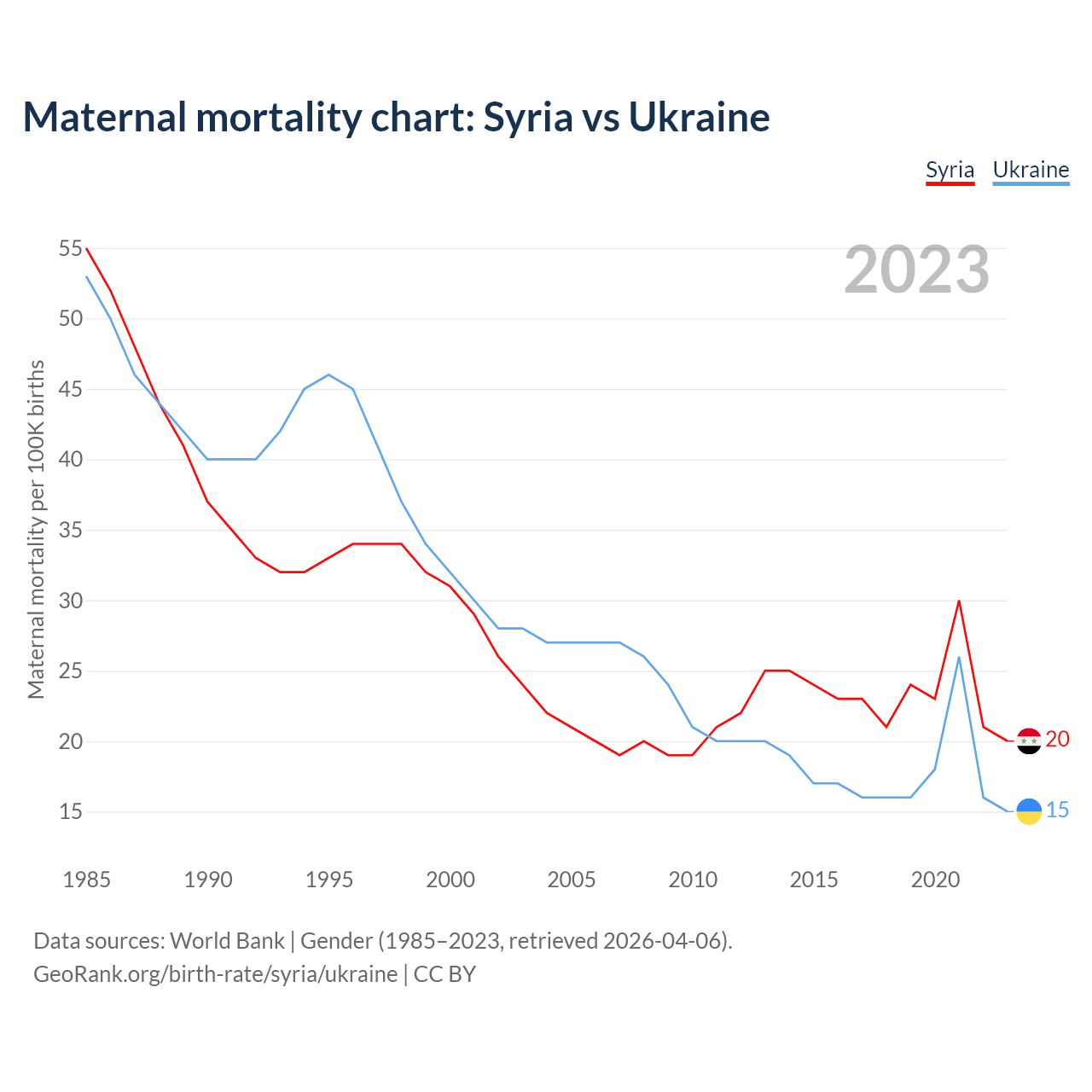 The maternal mortality rate, which is the probability of dying during childbirth or within 42 days of pregnancy termination, is 20 deaths per 100,000 live births in Syria, compared to 15 deaths in Ukraine.