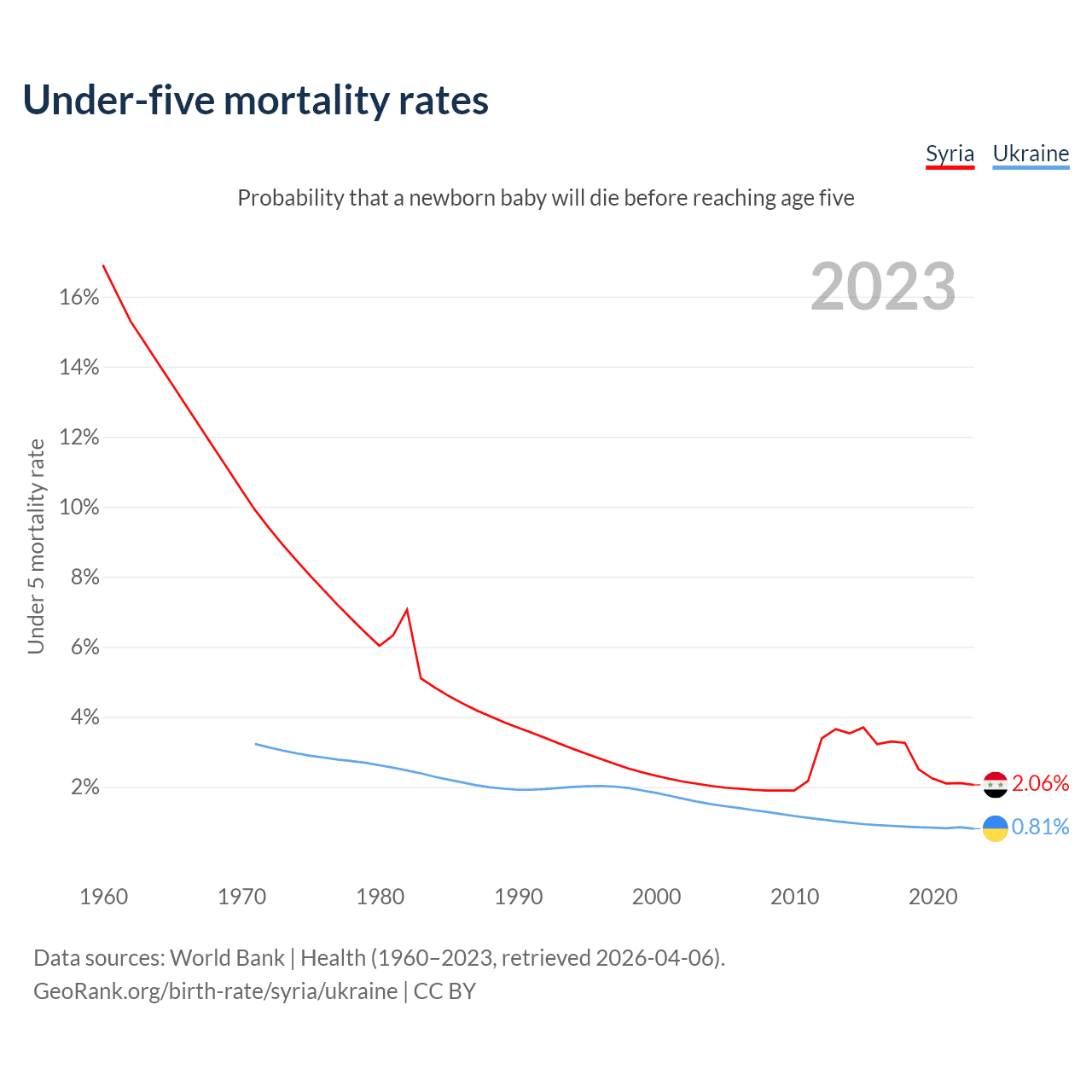 The chance that a newborn baby will die before reaching age five is 2.06% in Syria and 0.81% in Ukraine. Above is a chart with historical data on under-five mortality rates.