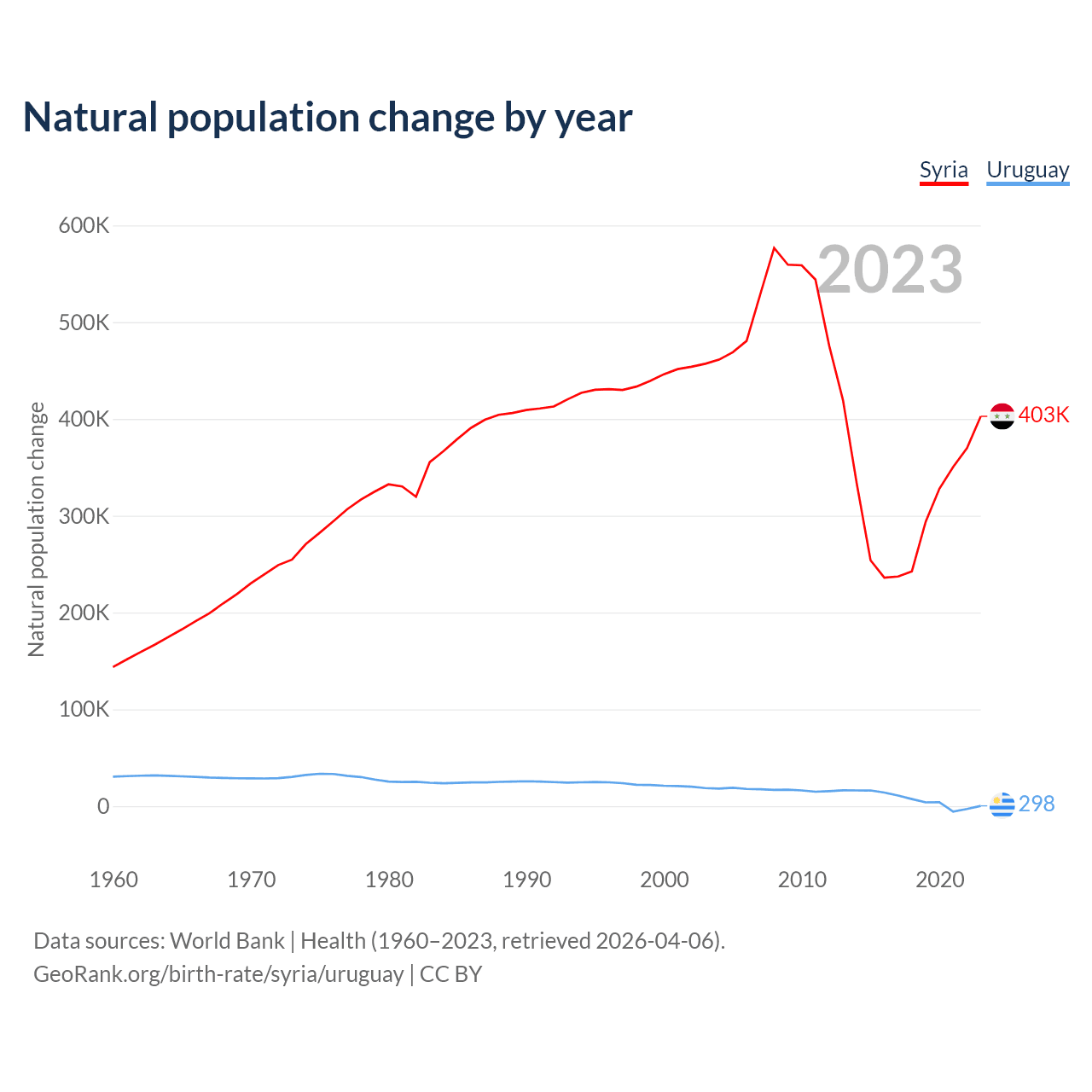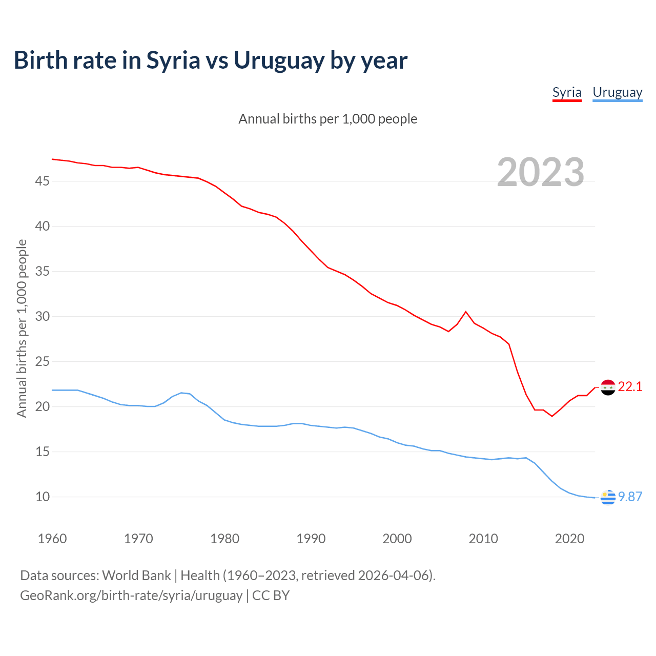 Syria has an annual birth rate of 22.1 births per 1,000 people, compared to 9.87 for Uruguay. The average number of children a woman is expected to have during her lifetime — the fertility rate, is 2.71 in Syria and 1.41 in Uruguay — 48% difference.