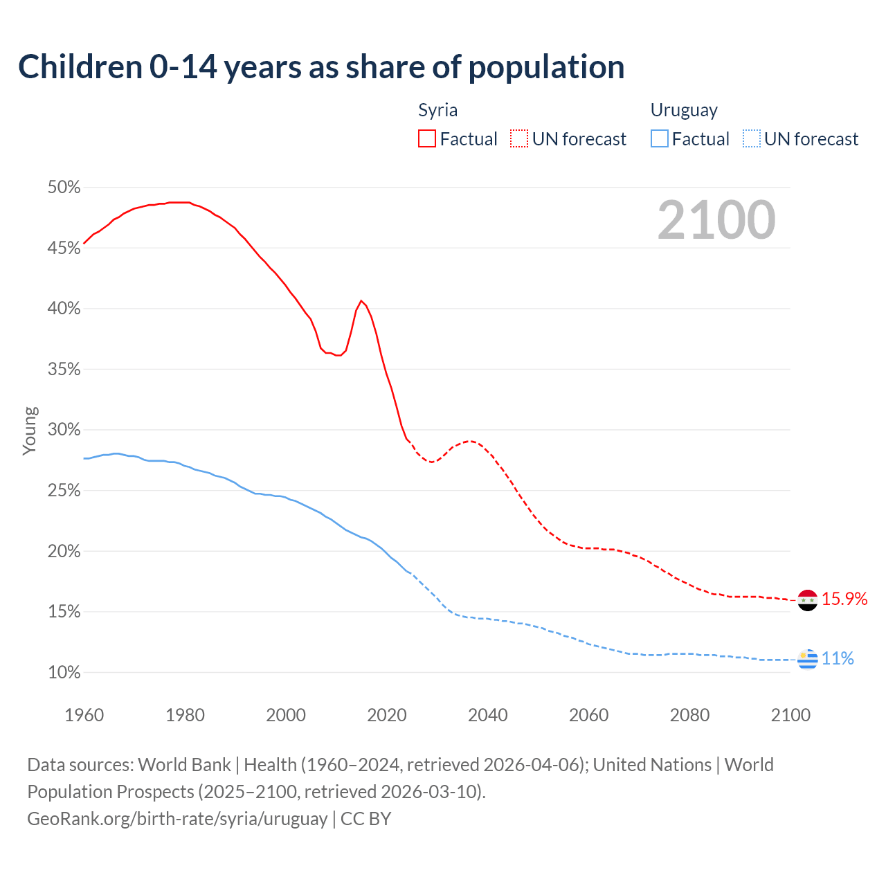According to the latest available data on birth rates, the fertility rate in Syria was 2.71 children per woman in 2023, compared to 1.41 in Uruguay in 2023. The replacement level is considered to be 2.1 children per woman.