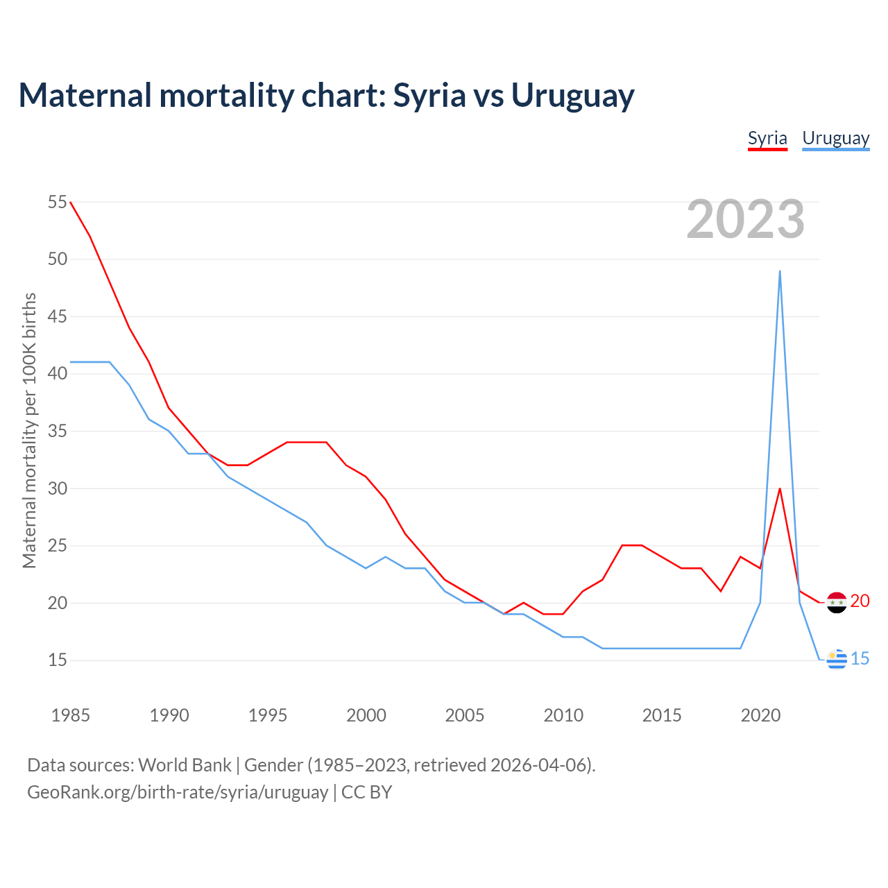 The maternal mortality rate, which is the probability of dying during childbirth or within 42 days of pregnancy termination, is 20 deaths per 100,000 live births in Syria, compared to 15 deaths in Uruguay.
