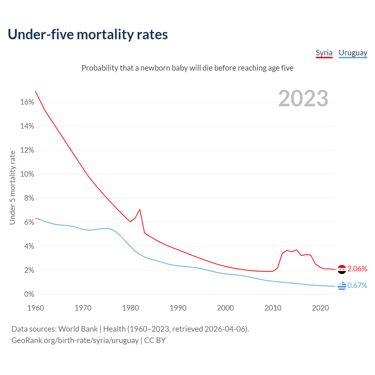 The chance that a newborn baby will die before reaching age five is 2.06% in Syria and 0.67% in Uruguay. Above is a chart with historical data on under-five mortality rates.