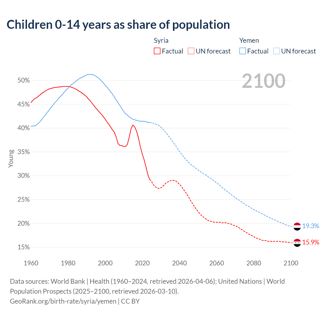 According to the latest available data on birth rates, the fertility rate in Syria was 2.71 children per woman in 2023, compared to 4.59 in Yemen in 2023. The replacement level is considered to be 2.1 children per woman.