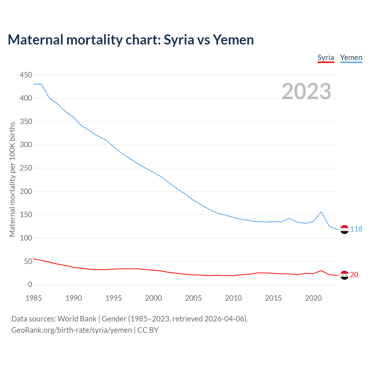 The maternal mortality rate, which is the probability of dying during childbirth or within 42 days of pregnancy termination, is 20 deaths per 100,000 live births in Syria, compared to 118 deaths in Yemen.