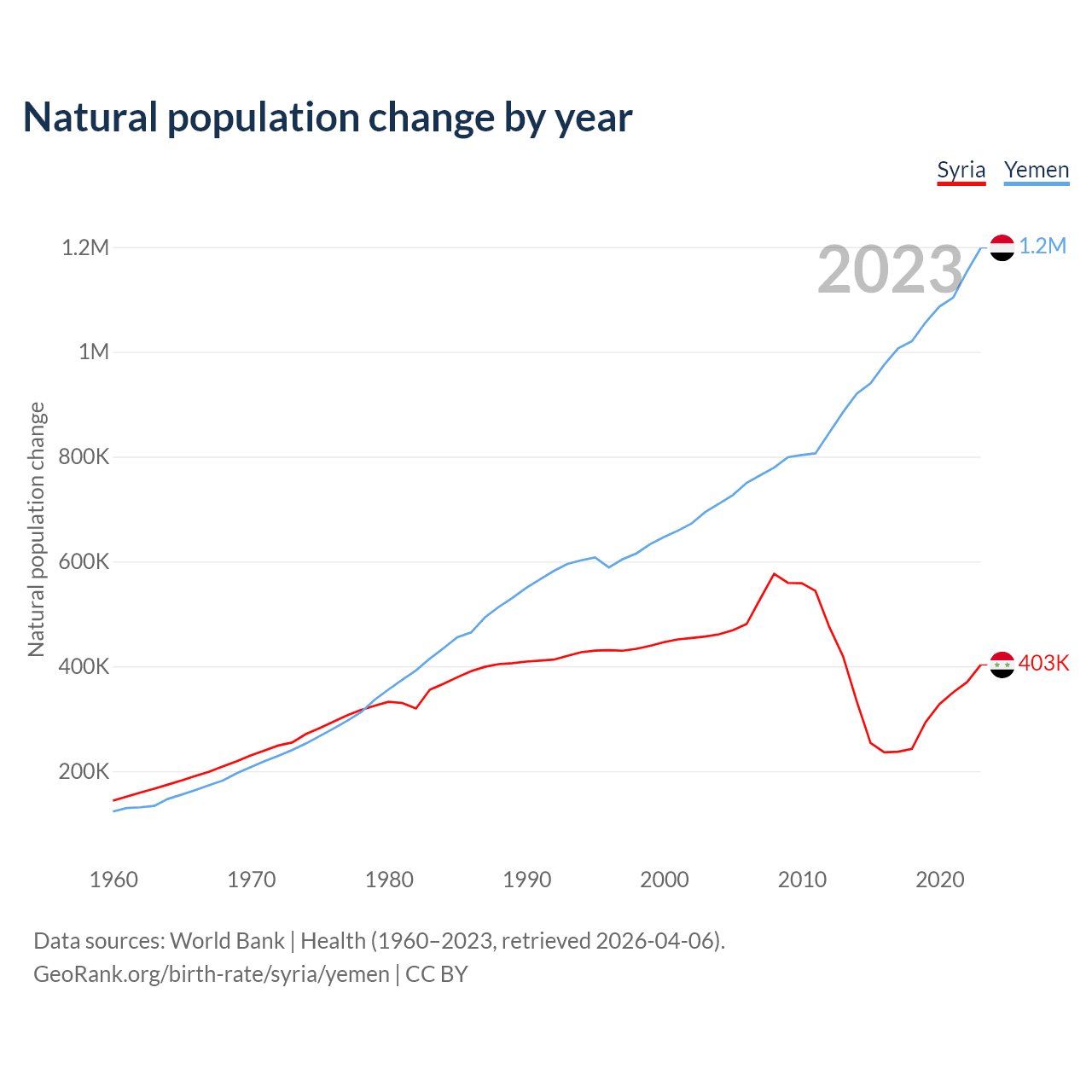Syria has an annual birth rate of 22.1 births per 1,000 people, compared to 35.2 for Yemen. The average number of children a woman is expected to have during her lifetime — the fertility rate, is 2.71 in Syria and 4.59 in Yemen — 69.2% difference.